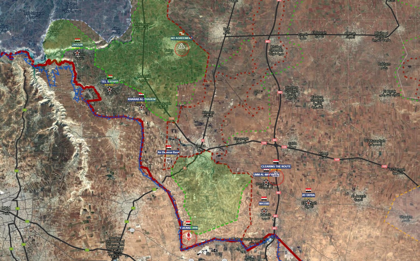 Сирийская арабская армия захватила Хараб аль-Шах, Тал Шихаб, Аль-Табриат и Зайзун. Разминированные зоны повстанцев разделены на две части, и теперь г.Дараа полностью окружен.
