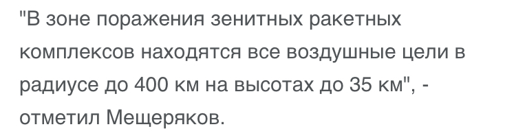 Цитата (12th @ Апр 16 2018, 20:15) А вот эта вот фраза про фсе воздушные цели в радиусе до 400км и на высоте до 35км она что обозначает? То и означает. Что тебя смущает? А у Булавы радиус вообще ого-го! Тебя это не пугает? -------------------- К несчастью, мир сейчас не таков, каким был раньше. Дети