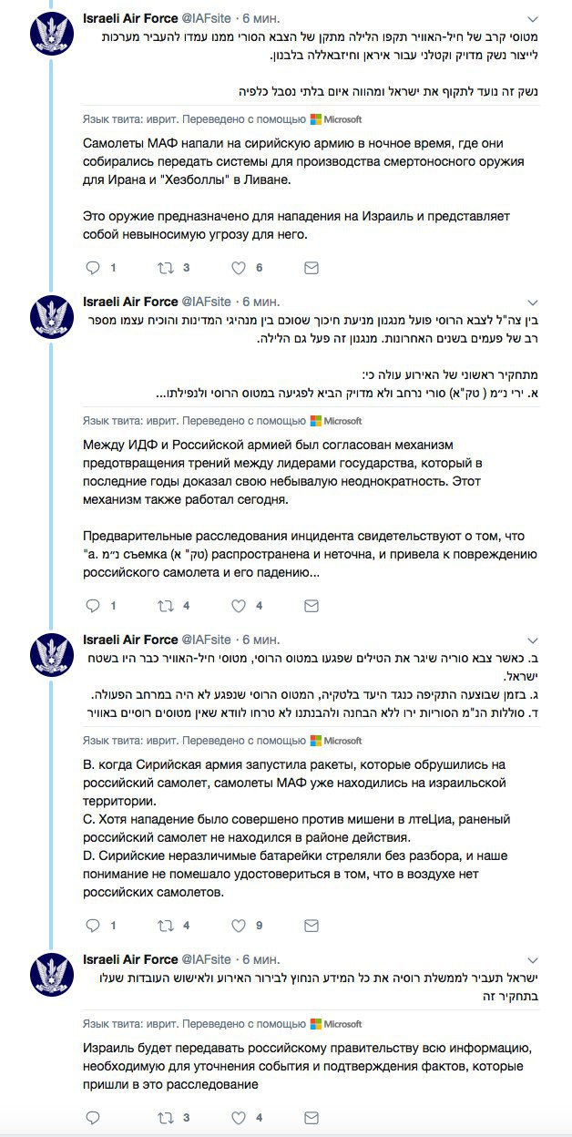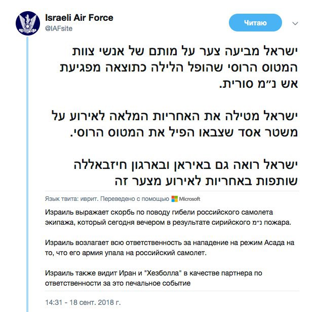 Цитата (fahed @ Сегодня, 11:45) Так что в связи с замечанием Михаила Исаковича и вчерашним неоднократным ! утверждениям сирийцев, чего это в этот раз - а не завалили ли сирийцы Ил и вправду тогда, когда израильские пилоты уже сладкий бубалех пили на подлете к базе. А сирийцы все еще пытались сбить что-нибудь. АОИ читает ВОФ! Цитата На момент запуска сбившей Ил-20 ракеты самолеты израильских ВВС уже находились в воздушном пространстве Израиля. Стоит ли говорить, что Цитата Израиль предоставит российскому правительству всю информацию, необходимую для разъяснения инцидента и уточнения фактов, представленных в этом расследовании http://newsru.co.il/israel/18sep2018/il_509.html -------------------- Такие как ты исподтишка тролят патриота © Madiev.