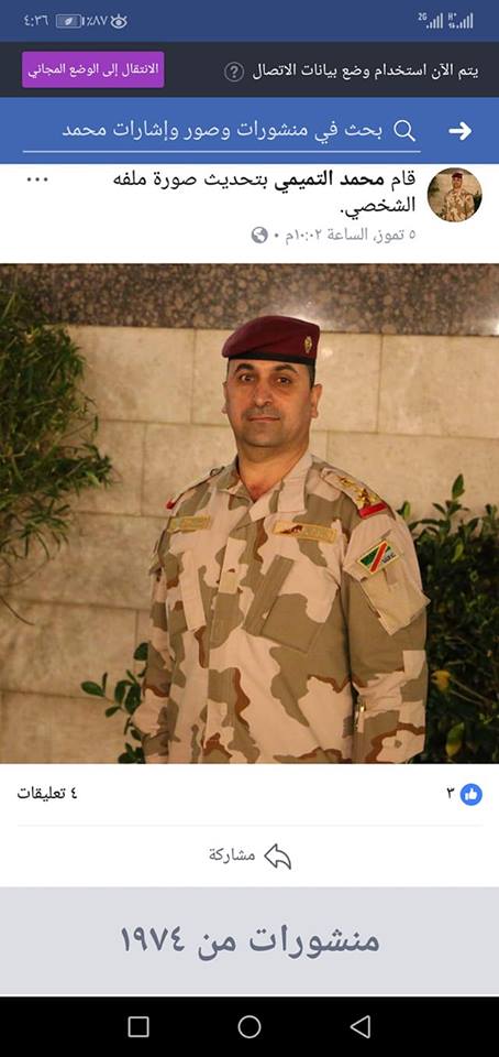 Цитата (Кирилл @ Июн 5 2019, 23:15) Западнее Багдада. Июнь 2016г. Генерал-майор Ахмед Салим Бахджат ал-Атби, командир 6-й дивизии. Полковник Мухаммед Казем Амер, командир 54-й бригады 6-й дивизии. Подполковник Заид Амер ал-Фавж, командир 2-го батальона 54-й бригады 6-й дивизии. https://www.facebook.com/133123640360505/po...285223715150496 https://www.facebook.com/permalink.php?stor...133123640360505 Бригадный генерал Мухаммед Казем ал-Тамими. Не позднее июня 2016 года назначен командиром 54-й бригады 6-й дивизии. Командует бригадой и на сегодняшний день. https://www.facebook.com/permalink.php?stor...100008556855003 Нажмите для увеличения |