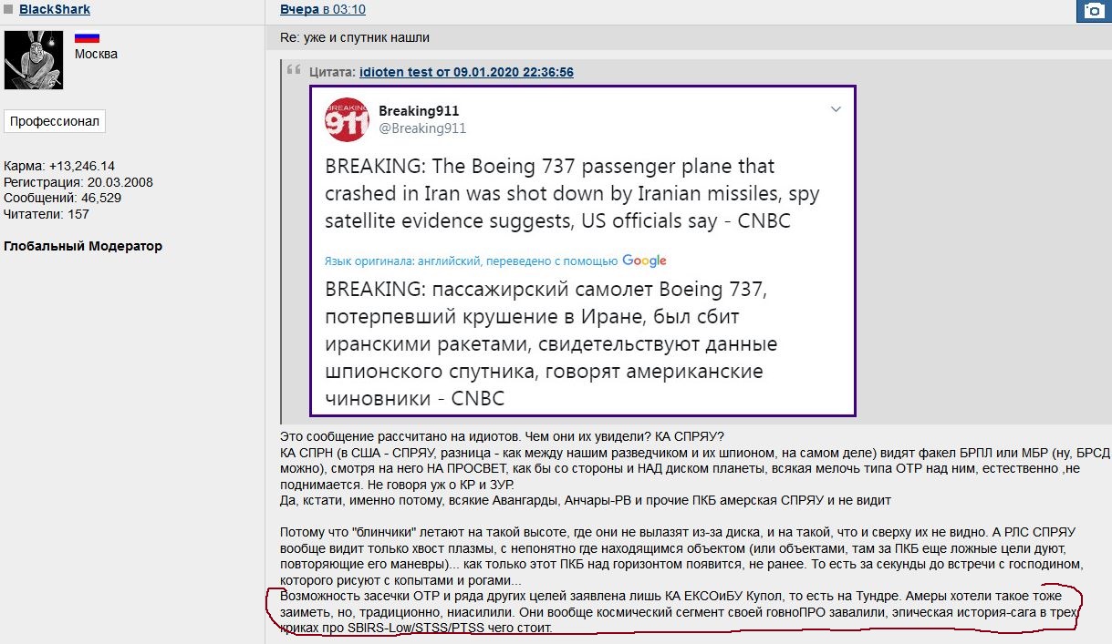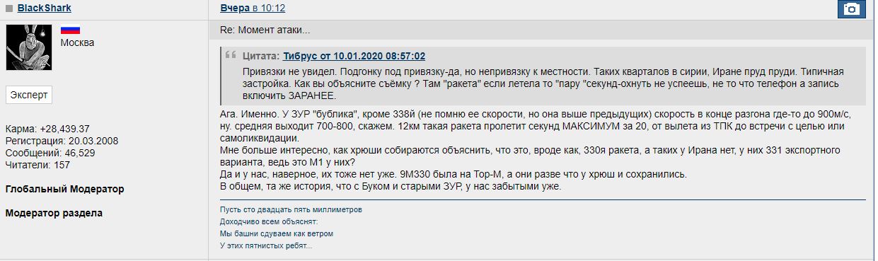 Цитата (Pampa @ Янв 11 2020, 15:14) Кстати штаты почти сразу про 2 ракеты сказали. Это к вопросу о системах объективного контроля. В РФ нету. Ты шо,выше я скрин дал,это у Штатов оказывается нету))ГАдюжник подтвердит. -------------------- Да чо там? Расследование, понятное дело, не сможет юридически достоверно установить принадлежность ЗРК, сбившего Боинг. А разные косвенные доки и всякие снимочки с интернета юридически ничтожны. На них заключение не построишь. Тут, кстати, тактика наших властей - вкидывать вагон вбросов, достаточно действена. Глядишь, за кучей фейков правдивая информация потеряется.