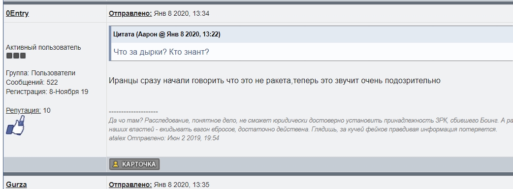 Цитата (Retwizan @ Сегодня, 18:26) Вот кто из вас в первый день написал, что самоль был сбит по ошибке иранской ПВО ? Допустим я,сразу указал на слова иранцев что самолет упал по технической ошибке," не был сбит",тут пахло примером Путина во время катастрофы МН17 с выходом в прямой эфир в полночь с соболезнованиями.Это точно такой же эпик фейл. Но ваши вбросы все один в один как с МН17,я приводил скрины с ГАдюжника.Даже тяжелые артилерию из пропогондонов сумели измазать в набросах там) -------------------- Да чо там? Расследование, понятное дело, не сможет юридически достоверно установить принадлежность ЗРК, сбившего Боинг. А разные косвенные доки и всякие снимочки с интернета юридически ничтожны. На них заключение не построишь. Тут, кстати, тактика наших властей - вкидывать вагон вбросов, достаточно действена. Глядишь, за кучей фейков правдивая информация потеряется.