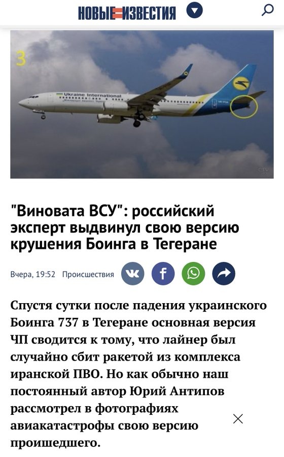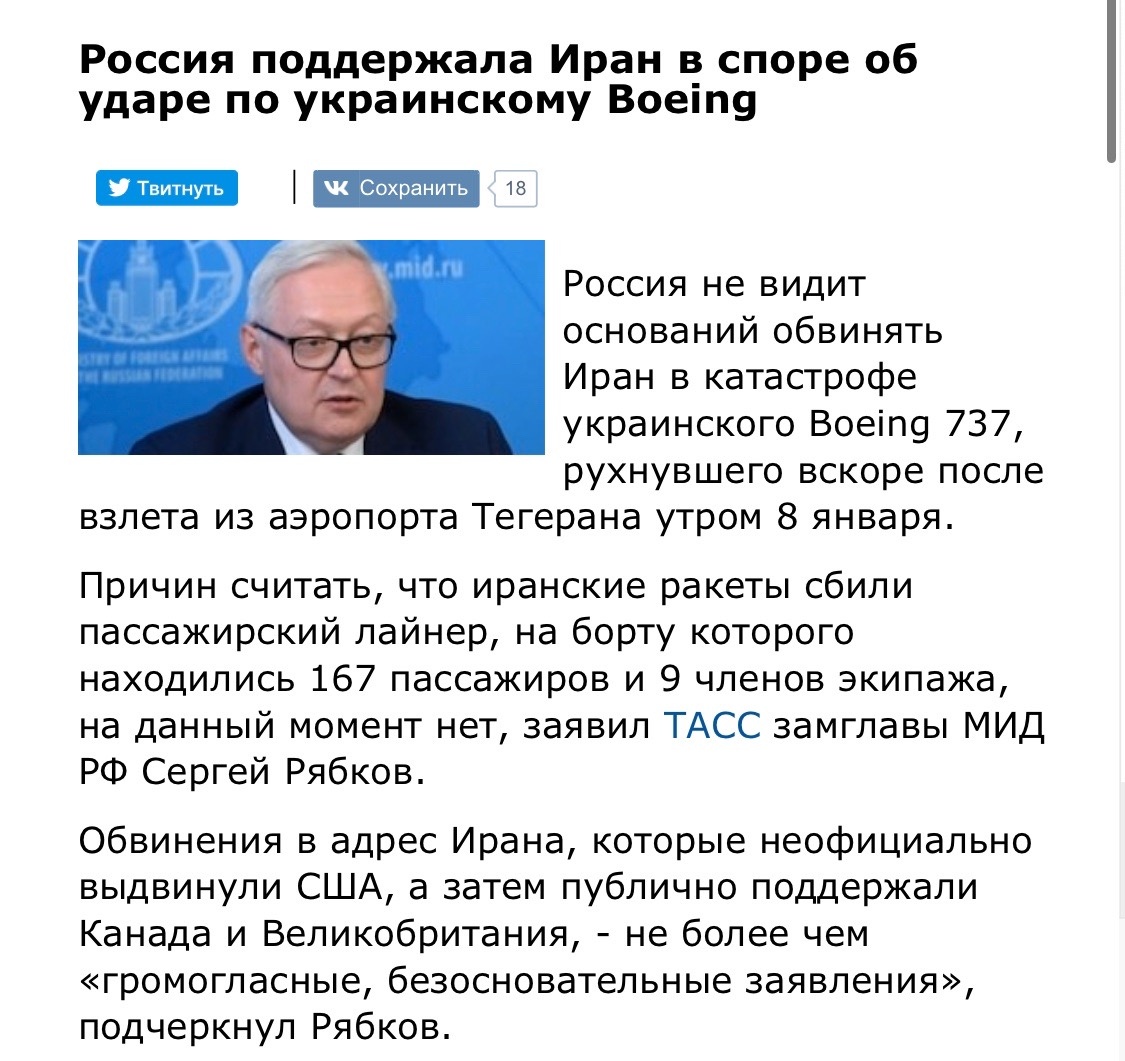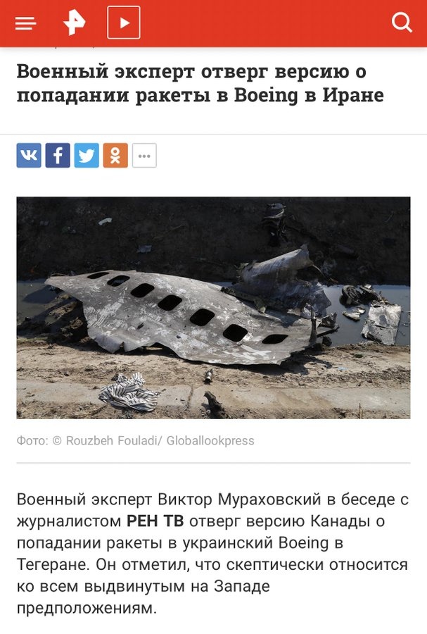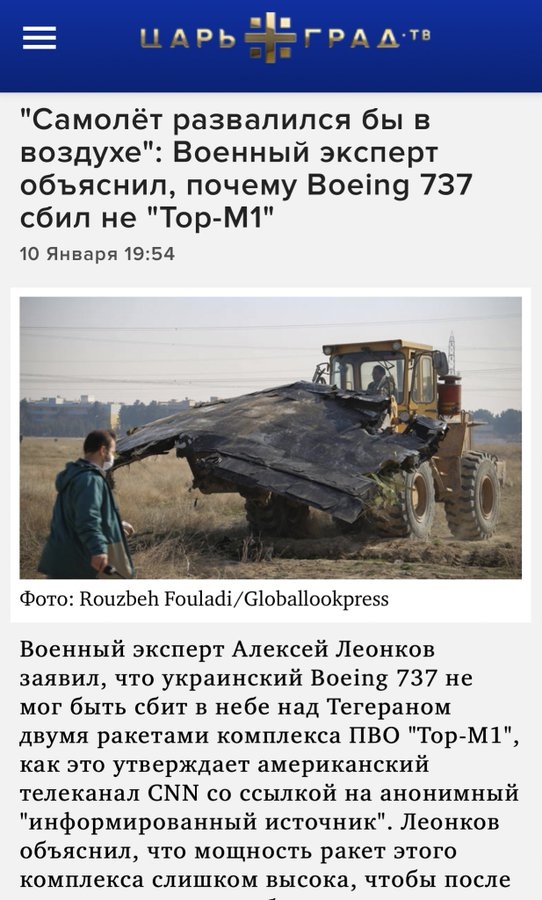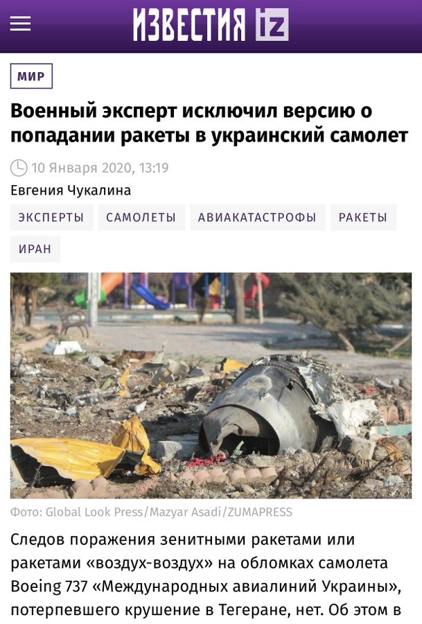 Цитата (Боговер @ Янв 11 2020, 10:11) После этого ничего не остаётся делать , как признаваться в случайном сбитие украинского самолёта. ( понятно , что это фейк , по крайней мере последний абзац ). Да я думаю все заметили, что только после жестких заявлений руководства прибалтийских республик, Иран начал осознавать во что он вляпался, и пошел не попятную. -------------------- При подлёте топоров, у российской ПВО резко сжимается