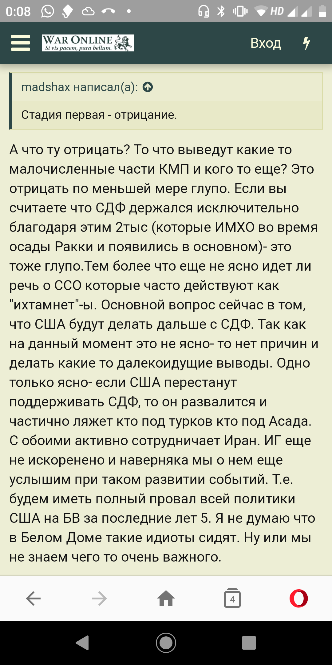 Цитата (slab105 @ Окт 9 2019, 19:07) А они тогда и остались. Забыл что свои танцы с бубном обр. 12.18 "амы бросили кукарекурдов, выводят войска". И ты как всегда спешишь, горячий мусульманский юнош.... ЗЫ. Покажи мне где я писал что американцы непременно останутся чтоб первыми начать воевать против турок на стороне курдов, а не станут отвечать на нападения последний если они решат их взять "на испуг"? А то я чет не помню чтоб я такое говорил... Амеры не остались, а подзадержались, но сейчас наконец выполнили свое обещание и свалили с истребованной турками части территорий, предоставив курдов на съедение туркоребелам ) и мы с тобой как раз и обсуждали те события, которые могут последовать после вывода американцев. И в рамках того, что будет именно после вывода войск, ты как раз и утверждал, что амеры войска то выведут, но вот вполне могут оставить там свои секретные ССО, сражаться с турками, когда последние таки закругляться со своим "низким стартом" и начнут свою операцию )) Цитата ЗЫ. Покажи мне где я писал что американцы непременно останутся чтоб первыми начать воевать против турок на стороне курдов, а не станут отвечать на нападения последний если они решат их взять "на испуг"? А то я чет не помню чтоб я такое говорил... Не лёгкое это дело с маневренными эстонцами диспутировать, приходится поднимать архивы, выискивать и скринить )) Ну держи "амеры могут вывести войска, но оставить секретные ССО" ![]() "ССО действуют как ихтамнеты" (привет слабу 2019 от слаба 2018 ) ![]() "секретные американские ССО будут воевать против туркоребелов, когда они введут войска?" ![]() "Такое вполне возможно!" ![]() Ну так что там - сидят там в таль Абьяде американские ССО? поджидают турок в своих секретных засадах? |