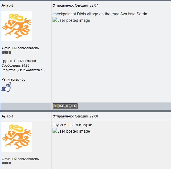 Цитата (Agapit @ Сегодня, 22:07) checkpoint at Dibis village on the road Ayn Issa Sarrin Цитата (Agapit @ Сегодня, 22:08) Jaysh Al Islam и турки Цитата (Agapit @ Сегодня, 22:08) минус 2 под Манбиджем Цитата (Agapit @ Сегодня, 22:11) Манбидж, утро Камрад, чёт твоих фотачеГ не виднА (( -------------------- Ценность любого оружия определяется успешностью его применения и готовностью к использованию в нужном месте и в нужное время.