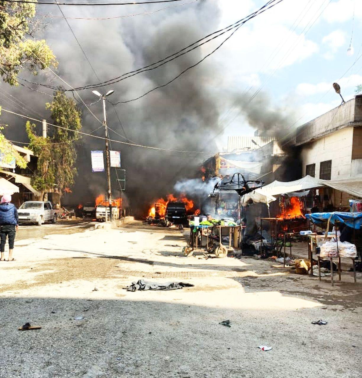 Теракт на городском рынке Африна, в результате взрыва загорелась цистерна с топливом. Свыше 30ти убитых.