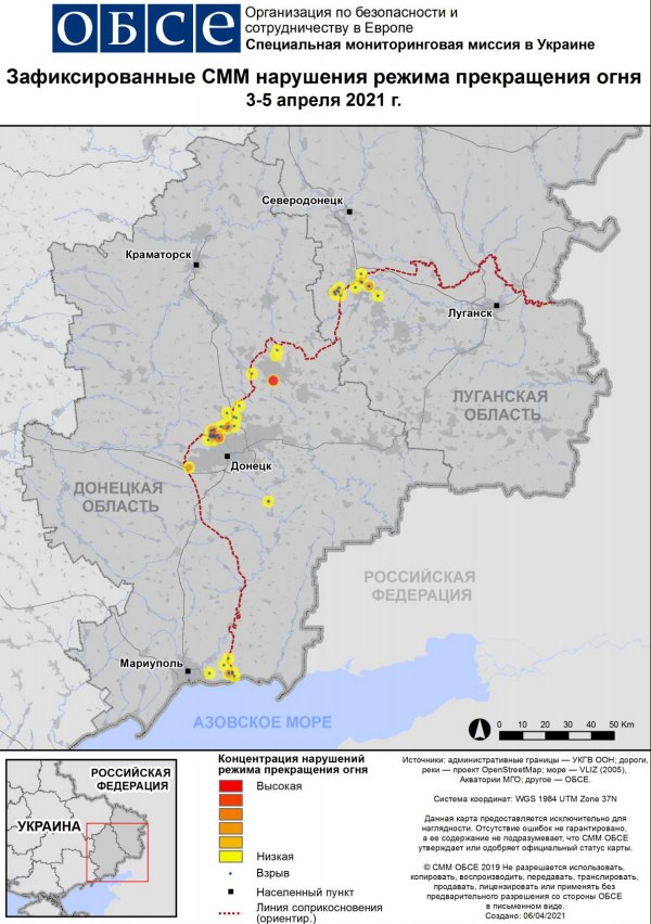 Цитата С вечера 2 по вечер 5 апреля в Донецкой области Миссия зафиксировала 1 424 нарушения режима прекращения огня, в том числе 281 взрыв (по оценке, 10 артиллерийских выстрелов и 271 взрыв неопределенного происхождения). 900 нарушений режима прекращения огня (выстрелы и очереди из крупнокалиберного пулемета) произошли в ночь со 2 на 3 апреля в районе к югу от н. п. Горловка (неподконтрольный правительству, 39 км к северо-востоку от Донецка). Остальные нарушения зафиксированы в районах к северо-западу от н. п. Донецк (неподконтрольный правительству) в ночь со 2 на 3 апреля, а также севернее н. п. Широкино (подконтрольный правительству, 100 км к югу от Донецка) в ночь с 3 на 4 апреля. |