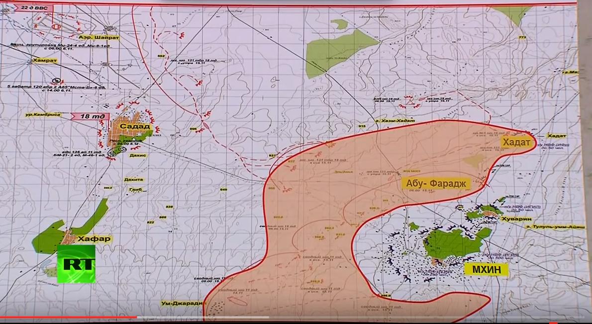 недавно была прессуха МО РФ и там разные картинки были одна из картинок Слайд выполнен на склейке листов карты километровки https://www.youtube.com/watch?v=RS2w1zzLrmg С вклейкой участка у авиабазы Шайраат в верхнем левом углу (можно затметитьс мещение вертикали а в гугл-мапс убедится что эта авиабаза находиться гораздо севернее Саддад чем по слайду) На авиабазе Шайрат находится управление 22 дивизии ВВС (насколько я помню перед войною по крайней мере у сирийцев было 3 или 4 дивизии ВВС, объединяющие авиачасти и пво, 20-х номерков – это видимо одна из них) Так же там имеется 4 вертолета МИ-24 и 1 МИ-8. Южнее авабазы, по видимому в этом городке http://wikimapia.org/#lang=ru&lat=34.44478...916895&z=15&m=h помеченном как «Army artillery base» Стоит 5 батарея 120 арт.бригады – 6 штук Мстба-Б. До города Махин 16 км, хоть и далековато – но работать можно. Далее Поселок Саддад. Обороняется «Республиканской гвардией». На западной стороне – в ур. Камбриса командный пункт 18 танковой дивизии, на южной окраине поселка –артдивизион 136 артполка 18 дивизии – аж 2 или 3 (лохо разборчиво) БМ-21 и 1 М-46, с недавнего вермени как видно по более поздним видосам группировка «нарощена» – 2 Д-30 и 1 или 2 М-46 Далее Внизу «сводный мотопехотный батальон» 11 танковой дивизии сосредоточился в на северной окраине Ум-Джавади ,и выставил севернее две охранные позиции 14.11 В непонятно какое время суток это батальон 15 .11 выдвинулся вправо отдельным колоннами и выставил четыре позиции на восток и юг от Махин (возможно – более в районе арсенала тоже, т.к. пятно нарисовано и вокруг Махин с юга – просто не попало в обрез слайда). Там находится вроде как побитый но еще более менее удерижвающийся арсенал Махин, возможно его частично использовали для прохода и протягивания сил дальше на восток. Далее Одни мотопехотный батальон 131 бригады 18 дивизии прошел полями-проселками (научились!) северее –северо-восточнее от Саддад. В процессе прохождения ,утром 15.11, влево выставлено 3 (или более)прикрывающие позиции. Сосредоточив колонну между вдумя предними (красная капля посреди слайда у отм.996 или 998) -вперед днем 15.11 на дальность до трех км выставлено еще 4 позиции на впереди лежащий отрог высот. Далее Севернее Хуварин на горе Хазм-Хадат, находится опорно-наблюдательный пункт какого то технического подразделения (треугольник с неразборчивыми значком сверху) 18 танковой двиизии -оттуда вышла бронегруппа и выставила к исходу 15.11 одну позицию внизу под собою у пос. Хадат. Как можно сделать суждение это был отвелкающий маневр. Тем времнем «один мпб» протянулся днем 15.11 между своих четырех новых позиций –и начал «спускаться севернее Махин» - выставив четыре позиции западнее, в стык с «смешанынм батальоном 11 тд». Это дивижение было на дальность 3-4км. Затем части «одного мпб» прошли влево по флангу выставляя позиции (всего общим счетом до 10 штук) вдоль цепочки охранения западнее Махин, пока не сошлись вместе со спустившимся к тому времени «постовой бронегруппой» у пос. Хаддат. Тут не очень понятно нарисовано, но можно предположить что четыре позиции ставшие задними –это район расположения тыла батальона (машин тыла, запасов, минометных частей). Всего «один мпб» вместе с «постовой бронегруппой» выставил 12 позиций. Имел два боестолкновения-боевых случая (по обе стороны от подписки Абу-Фардж – какой то затор увзоварнного поста слева от подписки и боестычка справа о