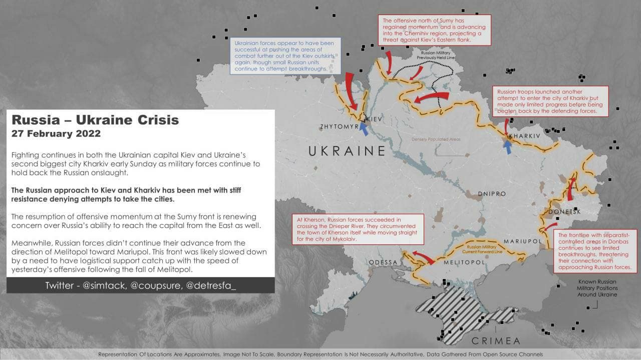 Цитата (Полес @ Сегодня, 14:30) На 27.02.22 это наиболее адекватная ИМХО. Меня удивляет то появляющийся, то исчезающий язык по левому берегу Днепра. Я так и не понял есть там кто-то или нет. И да, у тебя есть мнение на кой чёрт загнали войска в Черниговскую и Сумскую области? По Харькову тоже вопросы, но там хотя бы самим городом можно объяснить. В целом сделали именно тот идиотизм которого я лично очень опасался в январе. Такая масса техники занимается охраной каких-то деревень, да ещё всё это теряется от всех причин. -------------------- RIP, Issam Zahreddine (1961 – 18 October 2017).