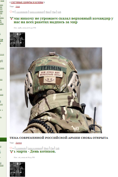 Цитата (Matt_Helm @ Сегодня, 18:02) Тут тоже не все однозначно "Эстонское грузовое судно затонуло в четверг у порта города Одесса в результате взрыва... Менеджер компании Игорь Илвес сказал агентству, что судно могло подорваться на мине." https://tass.ru/proisshestviya/13952135 Могли и накидать ночью Ну хз, тогда может есть ещё надежда на то что будет малость полегше. Как видим этих , что в 2014 году кривлялись на видосах и в ВК выкладывали, охотничьи байки травили, годами песенки сочиняли ( я русский солдат , у меня автомат и т.д.) и пословицы , не перкрщая смехуечков и плаплак деланного -выморочили и сбосали самый прорусский регион Укарины (Донбасс) и т.д и тп. - только пиздюлями и доходит. По заветам старины Бисмарка. Тут недавно про блоигра Altyn73 писали, сам скриншот его текущей странциы просто пиздецовый. Выше -закрепленное сообщение (будщей датой) -про весь мир ,класные такие громки выражения на бейджиках. (в сущности весь его ЖЖ посвящен военщине,частои толковые постинги,но как и мноиге -травлен шушшу из телерозетки) https://altyn73.livejournal.com/ А ниже -последний по вермени постинг - начал считать потери, охуел, дуплил 2 дня - потом поел говна,надел шапку ,сел на жопу ровно и постит про котков Весь мир оно собралось собирать,говно такЭ Нажмите для увеличения -------------------- Murem za polskim mundurem