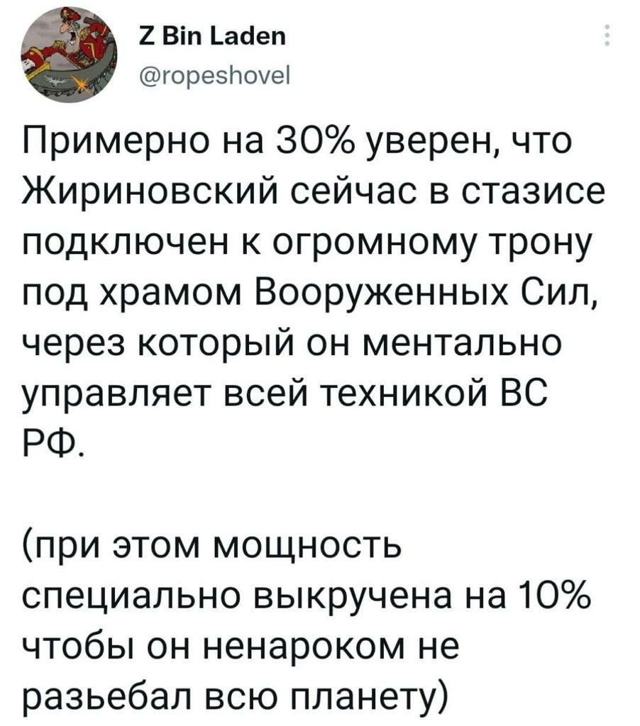 Цитата (Retwizan @ Мар 4 2022, 23:25) Это он в этот окопный год разведгруппу положил (завел на мины) чи ни? И не только лишь... Давно его знаю, с 8 г. Довольно долго и не оч хорошо, он просто играл придуманную самому себе роль и тихо посмеевался над Вот, собсно, потому и сваливает М-Давида, с похожей на правду, аналитики на голимый пиздёжь. |