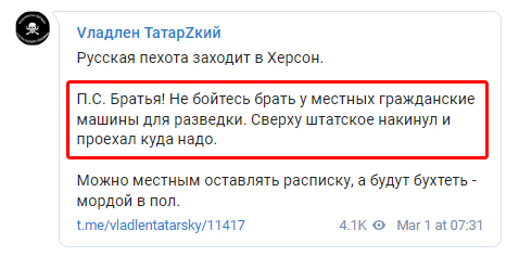 Цитата (slavikt @ Мар 1 2022, 11:05) Владлен Татарский мудрые советы раздает ну а че? вы ж освободители,нах работайте братья уебаны.... ![]() Для разведки, кем бы она не проводилась, это не "мудрый совет" а азы с букваря. |