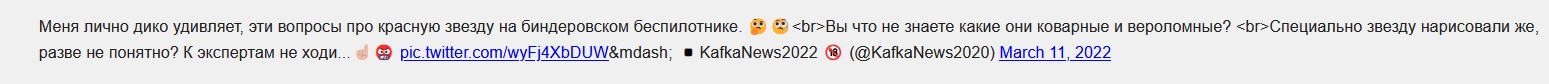 Цитата (Nechriste @ Мар 11 2022, 18:58) Этот? Меня лично дико удивляет, эти вопросы про красную звезду на биндеровском беспилотнике. 🤔🧐<br>Вы что не знаете какие они коварные и вероломные? <br>Специально звезду нарисовали же, разве не понятно? К экспертам не ходи...☝️🏼🤬 pic.twitter.com/wyFj4XbDUW— ▪️KafkaNews2022 🔞 (@KafkaNews2020) March 11, 2022 Я не понимаю-что "Этот"? Я вижу какую то абракадабру. Нажмите для увеличения -------------------- Вы нагло стяжали огромный запас знаний, и тенденциозно его используете в свою личную пользу. Я чую что я прав, но не знаю как это обосновать против такого исторического и интеллектуального чудовища как вы, и это меня злит!