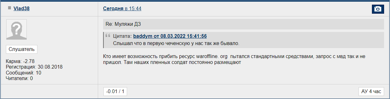 Цитата (Геб @ Мар 8 2022, 16:09) Тут на самом деле очень просто снять вопросы- опубликовать полный поименный список пленных на какое-то число. В идеале и сконцентрировать всех пленных в одном лагере - на какой-то простаивающей турбазе на Карпатах например. Выстроить на плацу - красивая картинка будет. И возить туда экскурсии западных дипломатов и журналистов. Кстати, не факт, что в Генштабе есть полный список потерь, и уж тем более там не могут знать. кого из пропавших без вести убили, кого пленили, а кто дезиртировал. Я сам удивлен что это еще не сделали. В российском генштабе большинство пленных и неэвакуированных убитых должны идти по категории пропавших безвести. -------------------- Zа макееVский рОдничок