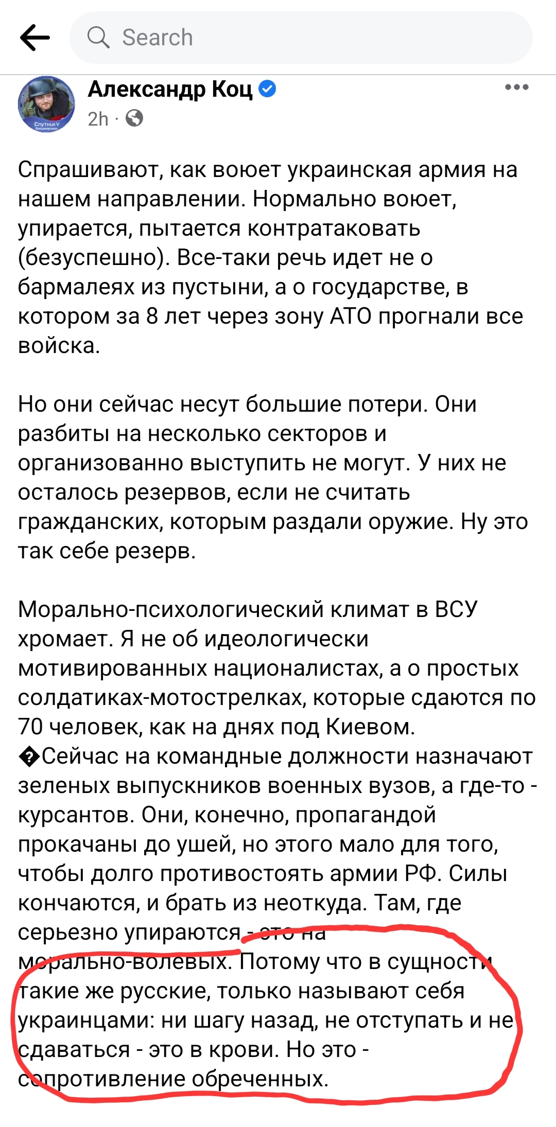 Цитата (Nechriste @ Мар 22 2022, 17:32) А что, там авиации много набили? Или он в целом о войсках говорит? А кто ж его знает. Ну он обычно про литаки пишет, и летчикам сопереживает. |