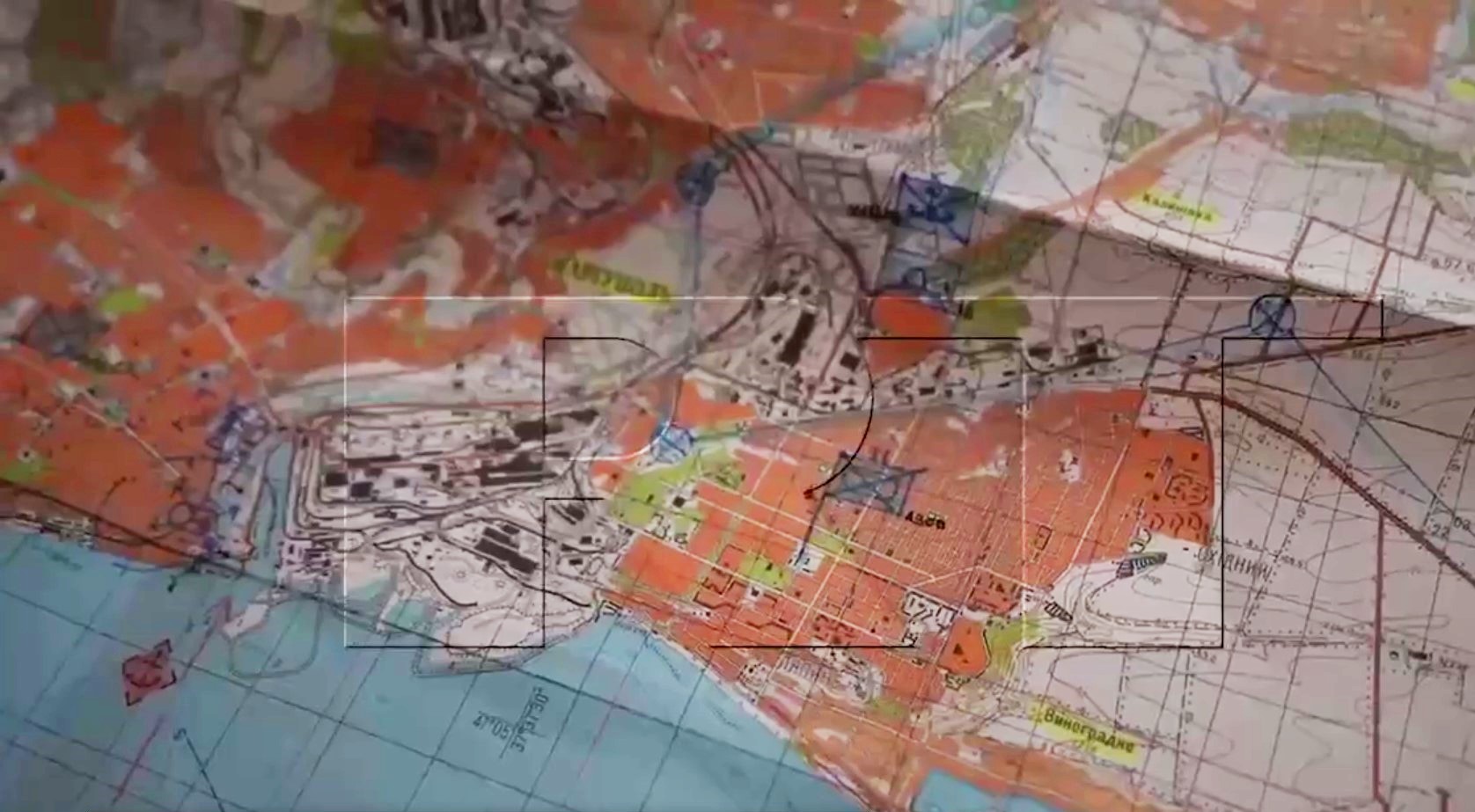 Карта из штаба "Азова" с обозначением полковых гарнизонов. Чуть севернее "Азова" в промзоне располагался штаб морпехов. Дня четыре назад он был распущен, замнача пару дней как споймали при попытке выхода из города.