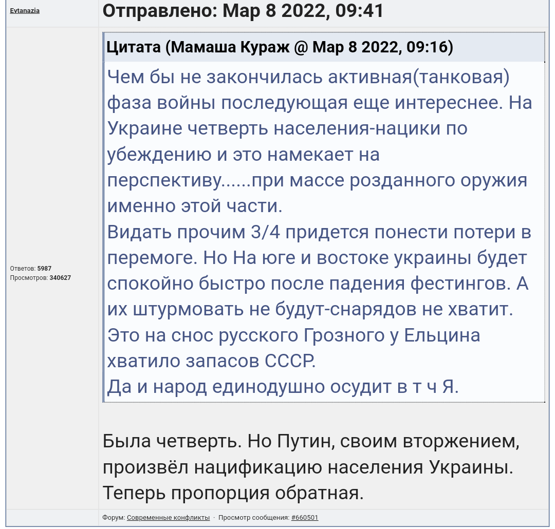 Цитата (Evtanazia @ Мар 29 2022, 07:40) Там пост от 8 Марта. А я пишу о феврале, о начале вторжения. Разоблачитель хренов. кому вы тут заливаете, товарищ? На дошираки хоть хватает? |