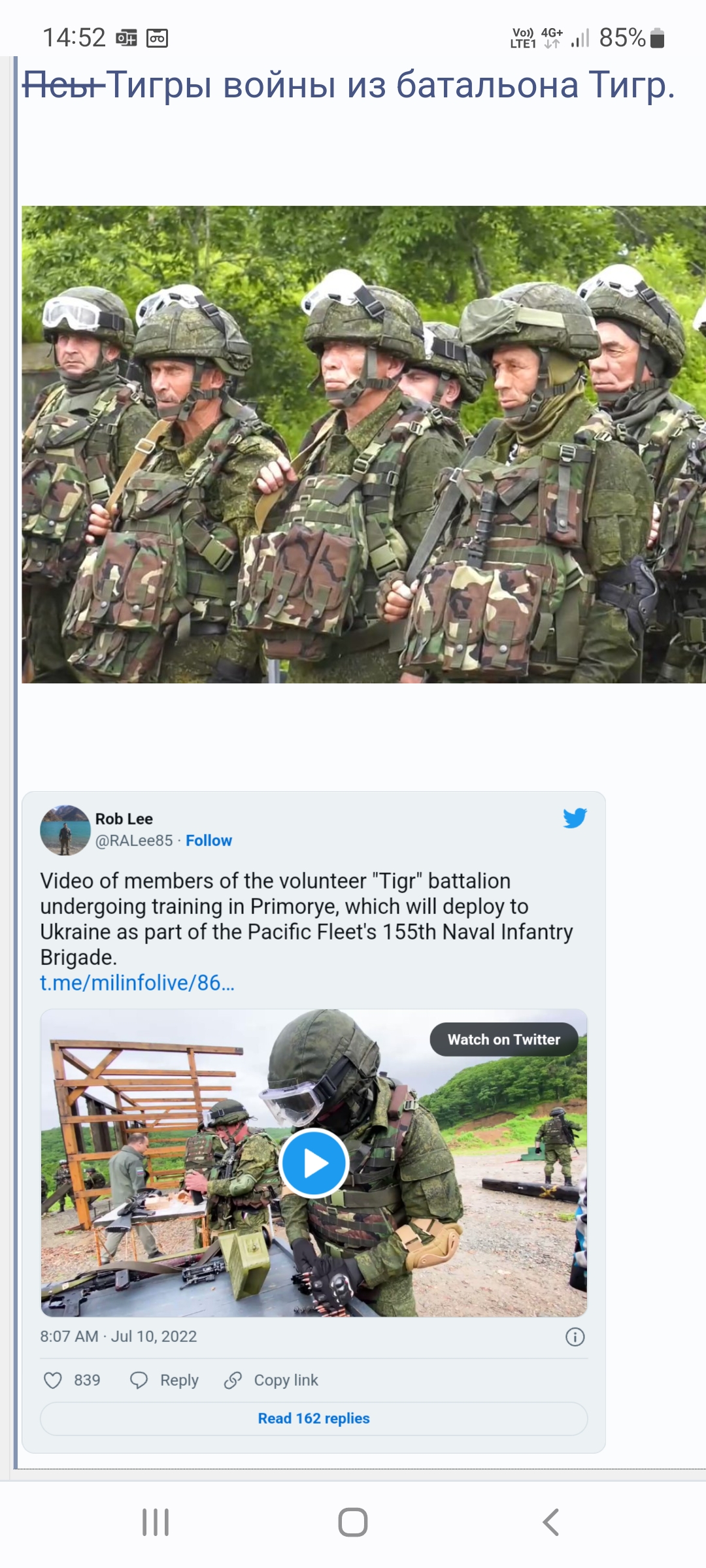 Цитата (Pampa @ Июл 10 2022, 11:10) ![]() Video of members of the volunteer "Tigr" battalion undergoing training in Primorye, which will deploy to Ukraine as part of the Pacific Fleet's 155th Naval Infantry Brigade.https://t.co/O0Irei0XFR pic.twitter.com/4Wm1eucAsS— Rob Lee (@RALee85) July 10, 2022 Помню был такой отряд Тигр , по борьбе с браконьерами в Приморье в 90 х годах , их в Краскино на заливе, на зимней рыбалке местные оглоблями отходили. вместе с телекомпанией Приморье .Когда местного мужика начали вязать за сетку . Это другой Тигр. Те в ментовском прикиде были . в черно голубом камуфляже -------------------- Количество предупреждений , умножает рейтинг на сто .