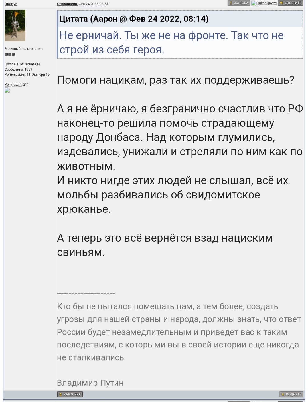 Цитата (slavikt @ Авг 4 2022, 11:53) Михалыч в 2008 еще был человеком и даже вменяемым он и сейчас вменяемый, просто затаился так проще сейчас очень многие в россии включили режим ZOV и функционируют в данном режиме везде в публичной сфере, не меняя настроек ну, чисто, чтоб если что, то не докажут товарищи маёры ничего у меня, среди российских партнеров по работе, таких несколько - в приватных разговорах с надежными людьми говорят то, что думают, а на своих страничках, на форумах, на работе и т.д. - они патриоты и за СВО всеми своими тентаклями вот и Михалыч такой |