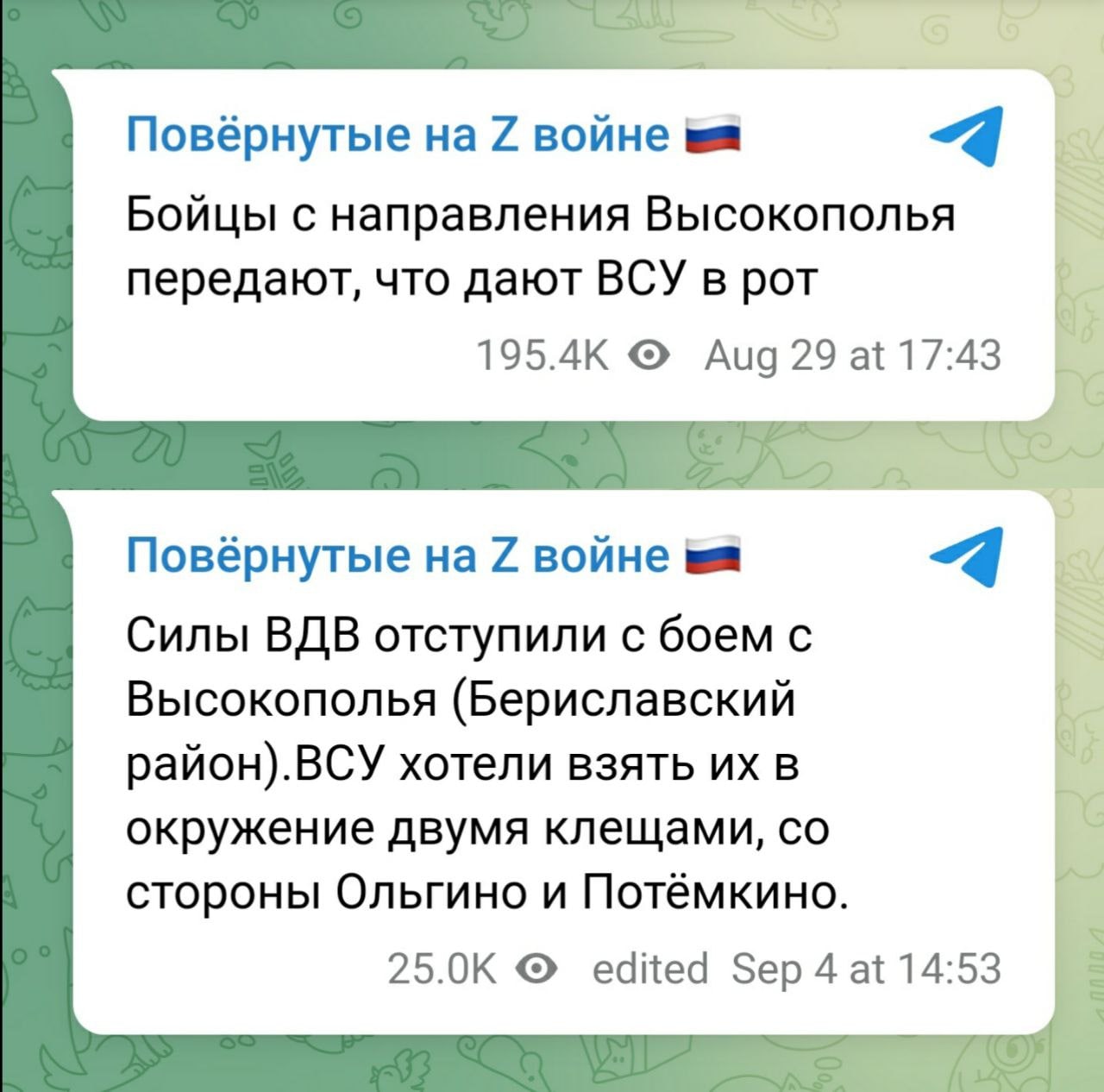Цитата (Zigzaur @ Сен 4 2022, 15:48) Ольгино, Потемкина, Высокополье, Архангельское несколько дней назад вроде тоже заявляли (не ручаюсь). Хорошо пошло вроде Не зря украинцы называют их пидорами. Только и мечтаний как дать кому-то в рот. ЗЫ: Архангельское позавчера заявляли ичкерийцы. -------------------- А теперь нам и говорить больше с вами нечего. Все хорошо известно нам.