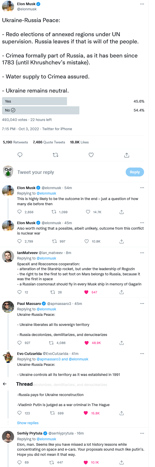 Ukraine-Russia Peace:<br><br>- Redo elections of annexed regions under UN supervision. Russia leaves if that is will of the people.<br><br>- Crimea formally part of Russia, as it has been since 1783 (until Khrushchev’s mistake).<br><br>- Water supply to Crimea assured.<br><br>- Ukraine remains neutral.— Elon Musk (@elonmusk) October 3, 2022 |