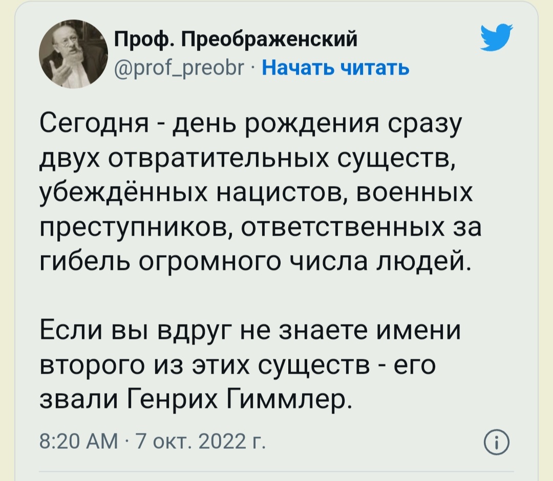 Цитата (fahed @ Окт 7 2022, 10:46) Еще так же напомню, что именно этот человек несколько лет назад топал ножкой и требовал назвать форум именем Путина я и сейчас этого требую это вы, трусливые нацптеродактели, либерашки и шмонькоподставленцы, типа тебя, полеса и пампония, зассали переименовывать форум. тьфу на вас, позор, срамота! да если бы не дядя Вова со своими проделками, на форуме не о чем было бы писать не о картошке же, и не о маце, и не о сале с ливерной колбасой - это никому не интересно а вот дядя Вова и россияне реально могут в создание новостных поводов и ярких, запоминающихся событий. форум нужно назвать, по старой советско-пломбирной традиции, Имени 70-летия В.В.Путина. например, в Минске есть парк имени 50-летия октября, в москве тоже такой был, была медаль в честь 100-летия Ленина и так далее а мы что, не можем повторить????? |