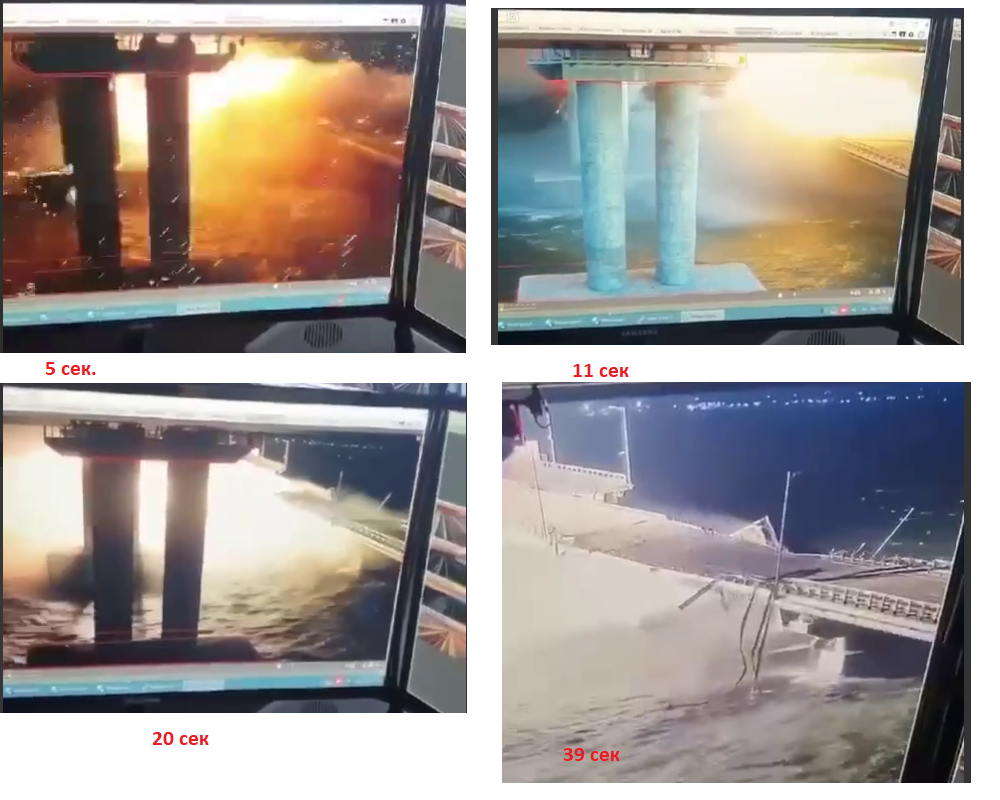 1. Свидетели фуры. Используют видео с камеры под жд мостом. Так же утверждают что при взрыве с воды был бы фонтан воды. 2. Свидетели морского БПЛА. В качестве доказательства используют видео раскадровки где взрыв будто идет снизу и сбоку. -------------------- Zа макееVский рОдничок