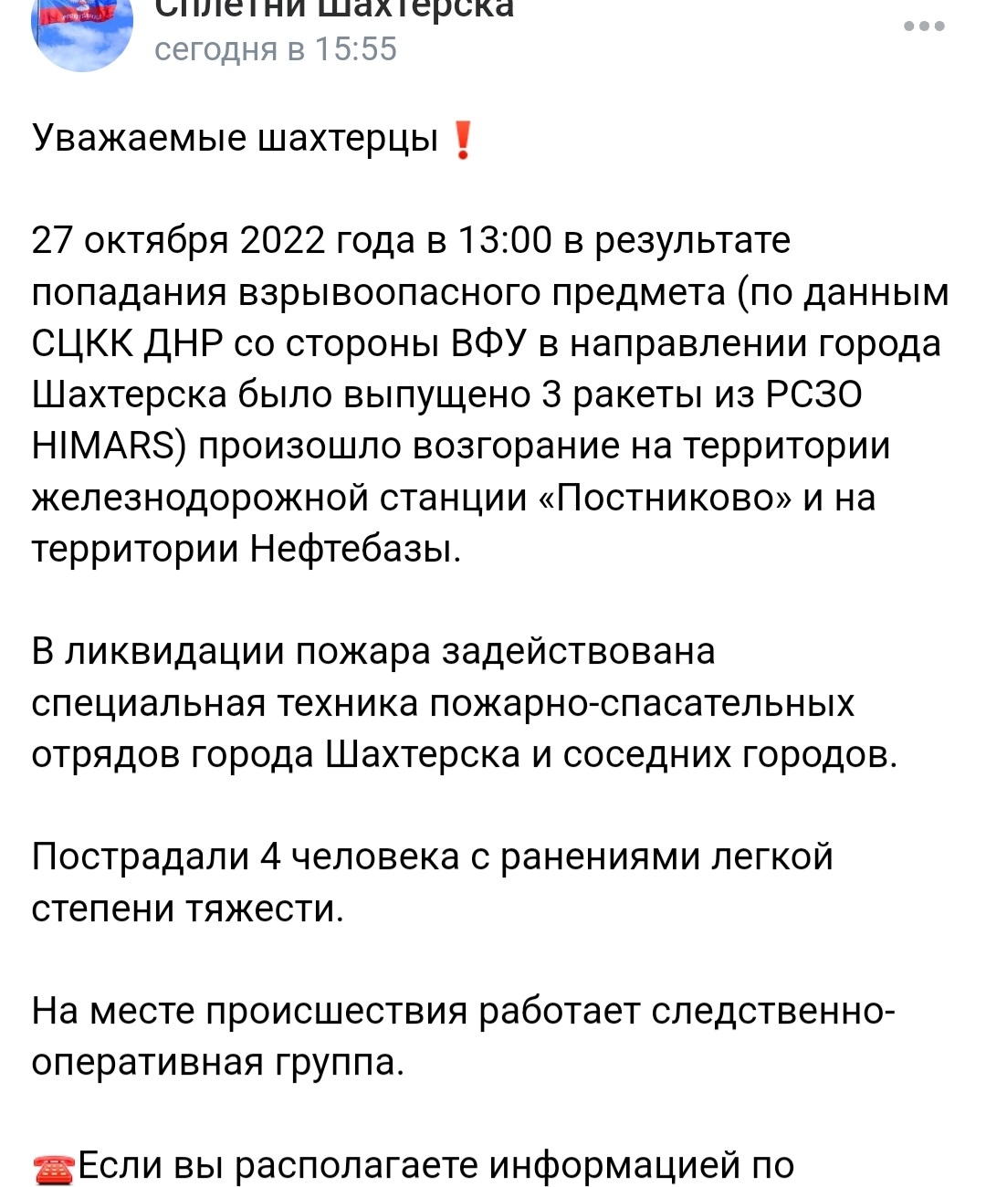 . Correction: two things are burning in Shakhtarsk again. #Ukraine #Shakhtarsk #Donetsk pic.twitter.com/JKTqVarCwD— (((Tendar))) (@Tendar) October 27, 2022 |