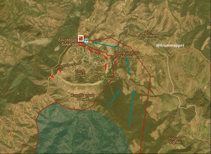 Если азербайджанцы вышли к развязке шуша-степанакерт (там где дрон-камикадзе долбанул танк), то смысла штурмовать город уже нет. Лучше закрепиться на окрестных высотах и взять подходы к шуше под плотный огневой контроль. Неделя беспрерывного артогня по шуше в таких условиях будет, на мой взгляд, эффективней боя в застройке.