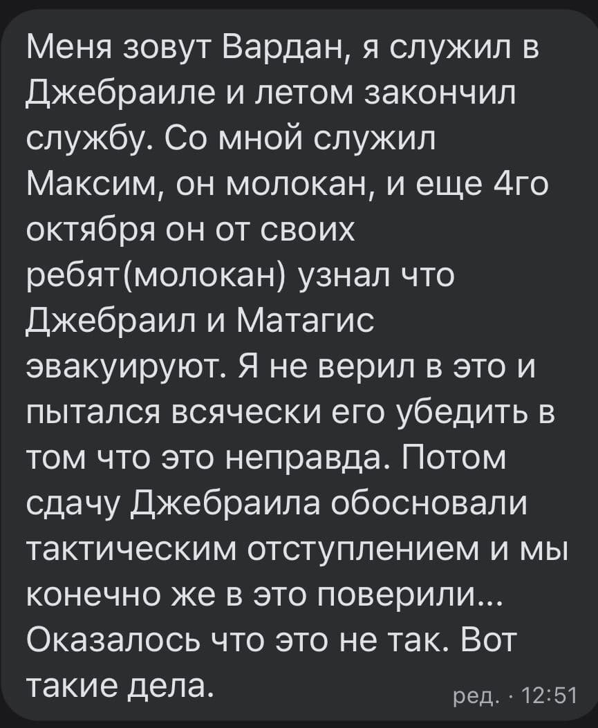 Цитата (Arqus @ Сегодня, 11:41) То есть армия Армении вступила в войну? Или погибли отдельные офицеры, видимо советники? Ты считаешь, что при население в 150 тысяч у НКР армия в 20 тыс. + 30 тыс резервистов - итого треть населения страны? Сотни единиц техники, сотни стволов артиллерии, какие то там С-300 и Торы - и это все без участия Армении на полную, только советники? А все остальное с неба упало (в том числе и тысячи людей Гарегин 2 намолил? Ну если ты не дошел до этого путем рефлексии то вот тебе инфо от профессионалов ЦАСТ - 70-80% солдат армии НКР составляют граждане Армении, среди офицеров больше местных, что конечно никак не отменяет наличие там большого количества граждан РА. Прекрасный пример тут нмоголетний министр обороны Оганян ,который с начала была замом министра обороны НКР, потом возглавлял корпус в армии армении, потом был минобороны НКР, потом НГШ армии армении и потом 8 лет был министром обороны Армении. Пиздец, 2020 год, олени Бэмби еще серьезно пытаются рассуждать о том, что армии НКР-ДНР-ЛНР - это независимые армии независимых государств, ну немношк советников просто есть. -------------------- Такие как ты исподтишка тролят патриота © Madiev.