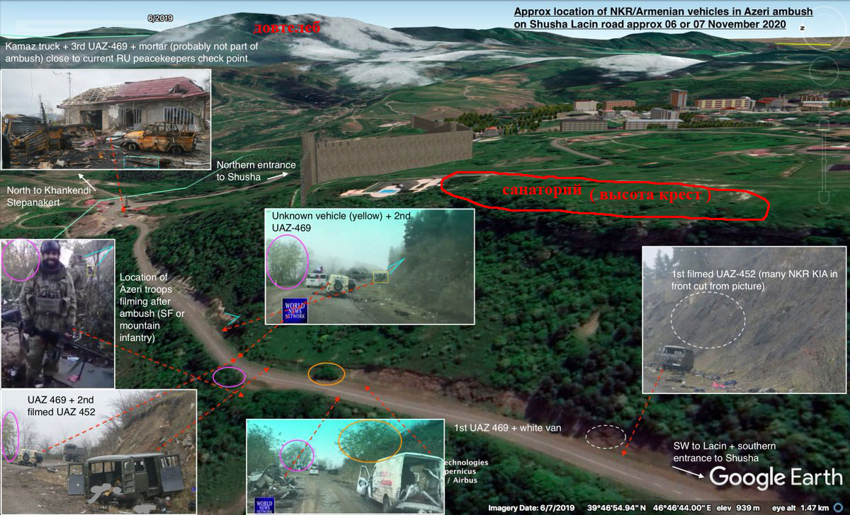 Цитата (Мотовило @ Дек 3 2020, 14:23) Правильно я отметил на рисунке? Т.е. получается когда армяне ехали по дороге, то они думали что наверху на "высоте Крест" свои, а там уже были азеры? Учитывая, что со стороны занятой азерами Шуши эта "высота Крест" особо ни чем не отделяется, это было опрометчиво. Вроде бы да, только азербайджанские позиции были ближе - на том месте которое перекрыто фотографией с камазом, то что вы показали это уже другая сторона котловины. По поводу Креста - я так понял со слов корров Анны - армянские части были на высоте - но в малом количестве и не очень боеспособны - причем они там даже после 7 числа оставались. Надо полагать что уже 6 числа там был слоеный пирог - ведь пленных раненных азербайджанцев собрали со склона - аж не доезжая до того самого скального поворота - они туда ведь попали как-то, не по дороге же пришли.. Учитывая местность пройти 25 спецназовцам ночью и занять позицию - труда не составило |