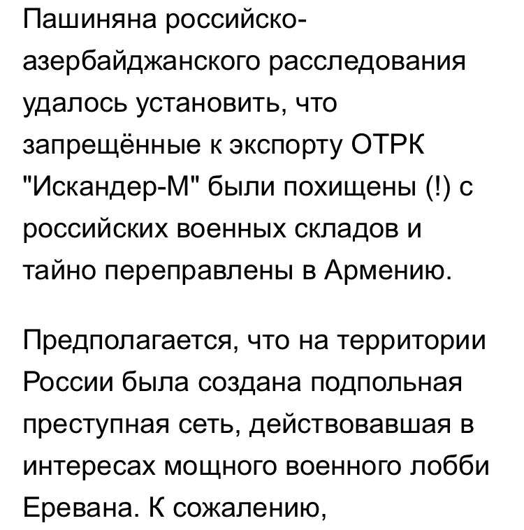 "В данной статье мы не будем разбираться как и откуда появились эти обломки у Азербайджана- пусть с этим разбираются "эксперты-конспирологи" и выстраивают свои теории про "привезли из Сирии", "купили у бомжей, которые нашли обломки на помойке" и т.д. В статье мы будем анализировать предоставленные на фото обломки, исключительно с технической точки зрения. Мы собрали топ вопросов (утверждений) по данному факту появления обломков и выстроим эту статью в формате "утверждение- наш комментарий". "на фото обломки Искандера первых версий (без М и нулевых годов), либо.... Либо это экспортный вариант." https://vk.com/@milinfolive-bez-nazvaniya -------------------- Вы нагло стяжали огромный запас знаний, и тенденциозно его используете в свою личную пользу. Я чую что я прав, но не знаю как это обосновать против такого исторического и интеллектуального чудовища как вы, и это меня злит!