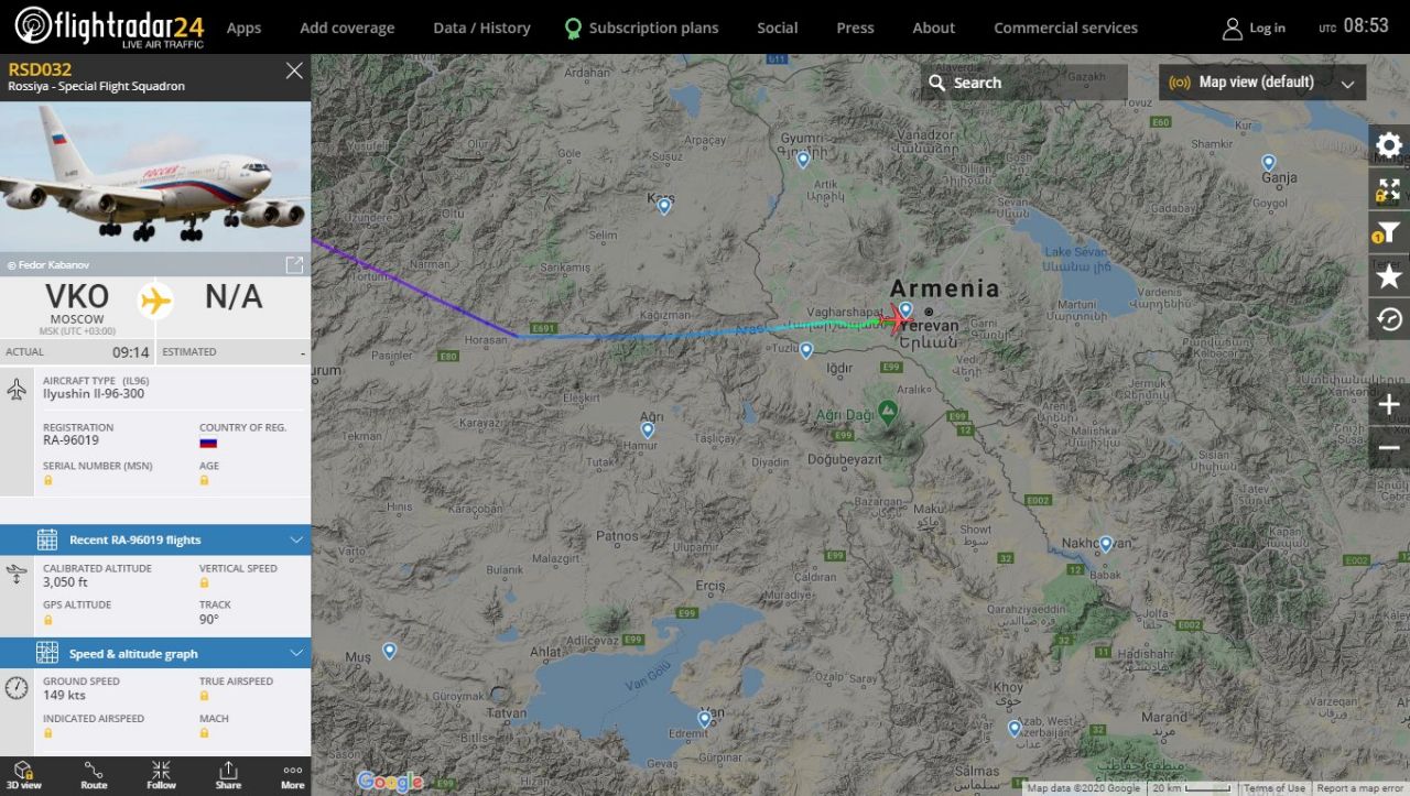 ❗️Пассажирский самолёт Ил-96-300 специального летного отряда "Россия" прибыл из Москвы в Ереван через воздушное пространство Турции.
