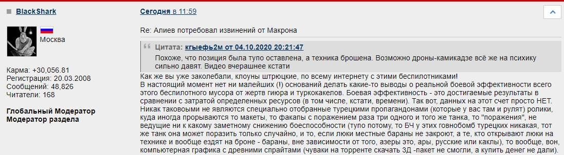 Цитата (Juan Carlos @ Сегодня, 17:49) Ну вот, а говорили - мультики, мультики. Но азервермахт дошел до места бомбардування и показал, что не мультики, а декорации в виде БМП, пушек и прочего. Вот вам и беспилотники. Вынесли артиллерийскую позицию + две единицы бронетехники, даже не вспотев, с каких-то летающих моделек. Тебе отвечает САМ Бэ-Ша с Гэ-А ![]() https://glav.su/forum/5/2815/5826695/#message5826695 Сам, бля. Без ансамбля. Вот хули тебе нипанятна? -------------------- Ценность любого оружия определяется успешностью его применения и готовностью к использованию в нужном месте и в нужное время.