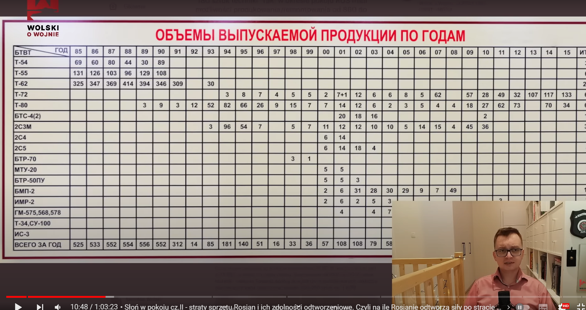 Польские блогиры оценивают возможности реомонта и производства бтт (по ремонту весьма консервативно,не учитвая возомжности цехов в ЦБРТ и БТРЗ) 1 Перво наперво картиночка, кому (всем) лень зыритьи разбирать польские слова - одного из БТРЗ (хз какого) Пруф ссылка видео откуда срезано https://www.youtube.com/watch?v=bEzlwOJZB0M 2 Ветка со всякими сузжденяими,цифрами (в т.ч. оценка потерь бтт обоих сторон) 11/n <br>Dodając wojska operacyjne plus korpus rezerwowy widać że UA potrzebowała bagatelka <br>~1200 czołgów, 1700 BMP, 1500 KTO/TO. I tej liczby SpW absolutnie nie było 24.II.2022.<br> Ponad połowa korpusu rezerwowego nie miała SpW z powodu strat z 2014-2017, o reszcie nie pisząc...— Jarosław Wolski (@wolski_jaros) January 7, 2023 Оно на польском, но цифры в общем понятные В целом он оценивает возоомжности востановления танков 250-300 семесйтсва Т-62 ежегодно ( т.к. их уже типа чинили и их пока еще много) и порядка 200-250 всяких Т-72,-80,90 - как модеорнизованных так и нет (т.е. у него или-или - типа мало уже соталось копрусов,на модернизации для Т-72Б3 использовались мобилизацоинные запасы ЗИП движков,пушек ,хзоткуда он это взял, так же продвали эти запасы движки ,стволы и зипы нза рубеж. и типа в максимуме 250-300 могут в год поднять и модернизирровать из травы,но тогда будет мало мобилизованных восстановительных ремонтов советского состава модификаций,нь или в какой то доле будут модернизованные,в какой то -советские составы оснащения после востановительных ремонтов, в общем (Т-62+ более новые -72,-80,-90) -порядка 500+ в год Нажмите для увеличения -------------------- Murem za polskim mundurem