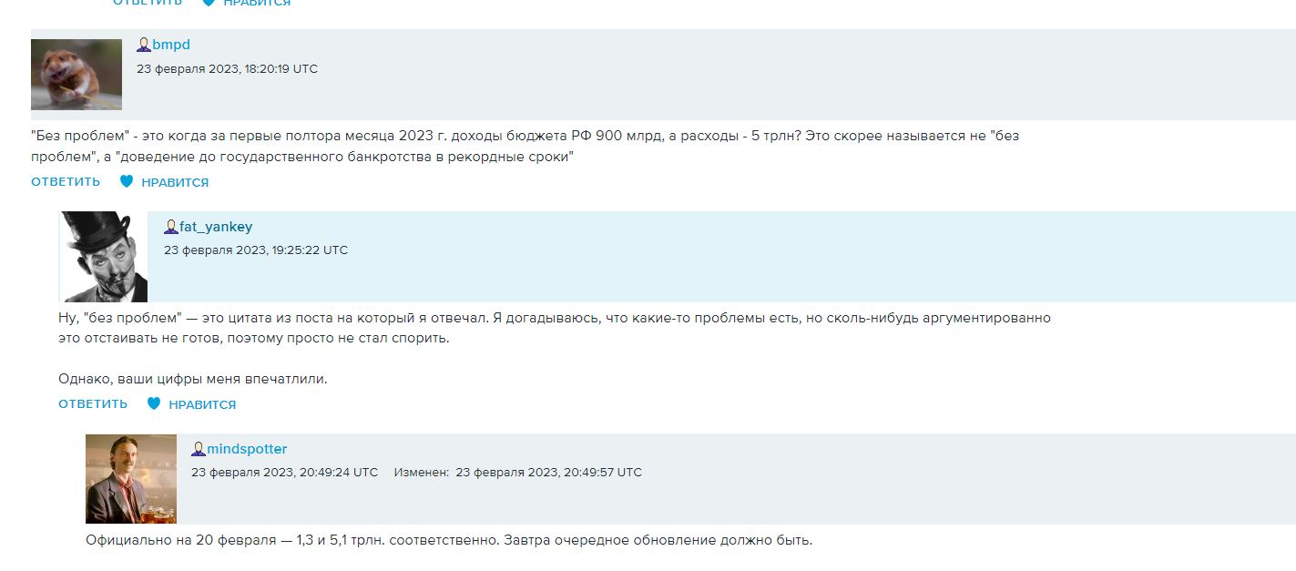 Цитата (Pampa @ Фев 24 2023, 17:01) А я ничего не ванговал. Но только на второй день стало понятно что у россиян серьёзные проблемы. На четвёртый начались переговоры и стал примерно понятен масштаб пиздеца. А через 2 недели в первый раз начали пугать ядрёной бонбой. И ещё аглийская разведка в первый день опубликовала потери россиян, там дикое число было. То что будет издец я ванговал ещё на стадии ввода войск влднр .. уже было известно от численности примерной 200-300 тыщ - но понятно что это надо делить на 2 итого 100 тыщ на захват 600 тыщ кВ км = 1 боец на 6 кВ км .. пока дебилы дрочили на искандеры ответа на то как рота в 120 человек будет контролировать квадрат в 30 на 40 км ответа я так и не получил .. был забанен на топ Варе и ещё паре аналогофф .. в ВО адекватные админы .. там я был занесён в адекватную оппозицию )) |