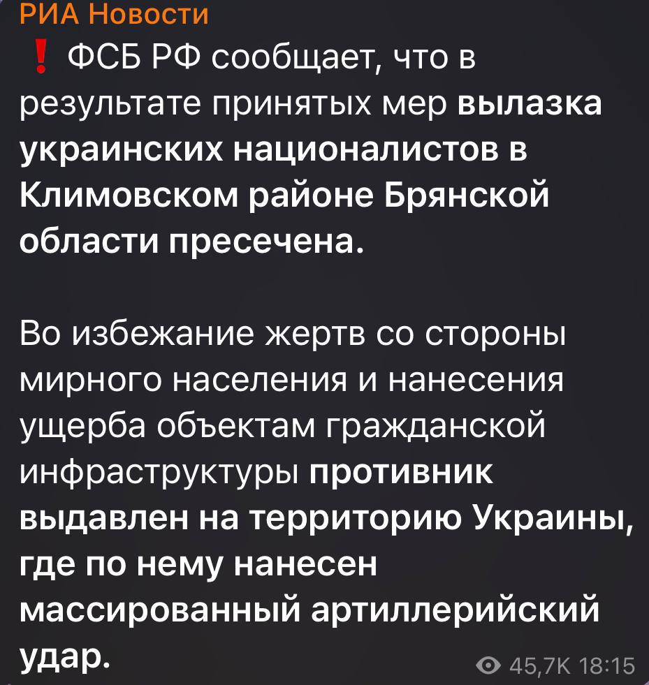 Цитата Вылазка украинских националистов в Климовском районе Брянской области пресечена, сообщает ФСБ РФ. Во избежание жертв со стороны мирного населения и нанесения ущерба объектам гражданской инфраструктуры противник выдавлен на территорию Украины, где по нему нанесен массированный артиллерийский удар. |
