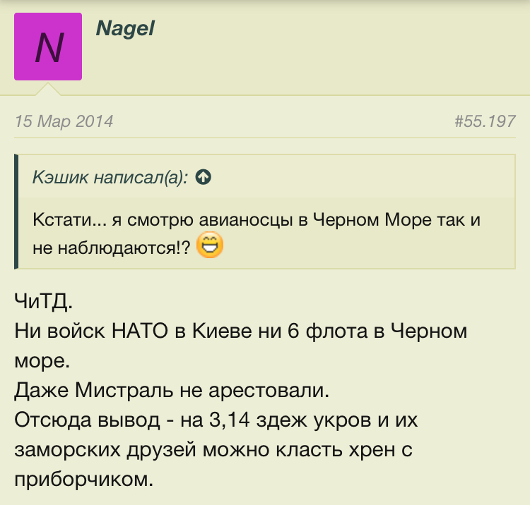 а про пиздежь укров - цитата википедии! https://ru.wikipedia.org/wiki/%D0%93%D0%BB%...81%D0%B8%D1%8F) Цитата Военная разведка участвовала в планировании и осуществлении операции по присоединению Крыма к России в феврале-марте 2014 года[9] где [9] это: https://www.kommersant.ru/doc/2888962 Коммерсантъ (8 января 2016). Проверено 8 января 2016. в которой написано: Цитата ....выразили президент РФ Владимир Путин и министр обороны Сергей Шойгу. Последний отметил, что под руководством Игоря Сергуна система российской военной разведки «получила свое дальнейшее развитие, функционировала с надлежащей эффективностью, своевременно вскрывала новые вызовы и угрозы безопасности Российской Федерации». В частности, именно генерал Сергун принимал непосредственное участие в планировании и осуществлении операции по присоединению Крыма к России в феврале-марте 2014 года но ты Nagel, сильно не обижайся - тут все свои оттуда моих цитат тоже можно набрать отуда дофуя и трошки Но с другой стороны - я то просто диванный ботан из интернетного неоткуда , а ты типа очевидецЪ. Поэтому "пиздеть как очевидец"(тм) начинать,прошу тебя пожалуйста, не надо . -------------------- Murem za polskim mundurem