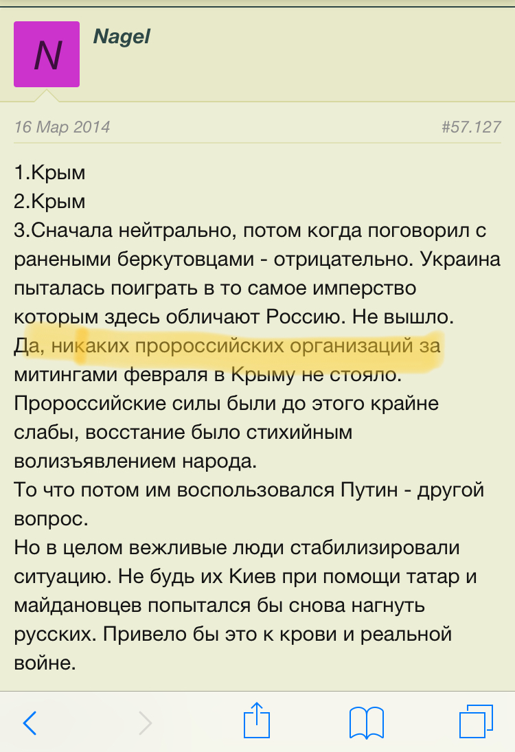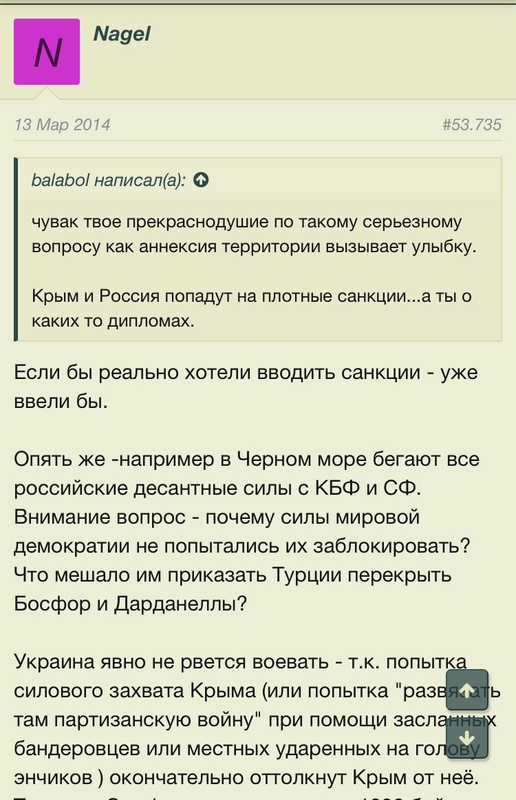 Цитата (Саша Белый @ Янв 20 2018, 18:30) Про "никаких пророссийских" у меня есть но ты Nagel, сильно не обижайся - тут все свои оттуда моих цитат тоже можно набрать отуда дофуя и трошки Но с другой стороны - я то просто диванный ботан из интернетного неоткуда , а ты типа очевидецЪ. Поэтому "пиздеть как очевидец"(тм) начинать,прошу тебя пожалуйста, не надо . Nagel тоже приветствую тебя тут. Я тоже от туда сюда пришол. Нихера никого не слушай. Пиши как есть, и как воспринимаешь действительность лично ты. Особенно будет интересно как там именно сейчас дела идут. Как люди окружающие тебя реагируют на понятие "Крымнаш" ,каков на твой взгляд процент сочувствующих было после референдума и сейчас? Много ли есть ностальгических моментов по домайданным временам? Есть ли в текущем положении дел, то что кажется не приемлемым? Моменты какие столо лучше/хуже? Смотрите ли по привычке укроТВ ? Да всё интересно, от цен на сало до качества сотовой связи/интернет.. да всё пиши. -------------------- "Интеллигентом стать очень просто - надо просто выкинуть из машины бейсбольную биту и вместо нее положить красивую металлическую клюшку от гольфа." © Бармалей