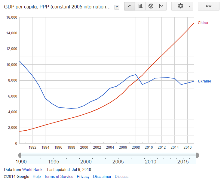 Цитата (Juan Carlos @ Май 12 2019, 22:09) то есть, было время, Союз был на втором месте? а правда, что ВВП Китая был примерно равен ВВП Украины в 91 году, или брехня-подтасовка? а то я про это несколько раз упоминал, а щас засомневался в правдивости источника Общий или подушевой? Общий всегда был сильно выше, а вот по подушевому Китай обошёл Украину только к 2009 году |
