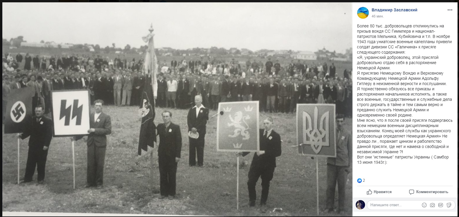 Цитата (fahed @ Июл 30 2019, 11:24) 28 липня 2019 року на Меморіальному кладовищі військовиків Першої української Дивізії «Галичина» в с. Червоне Золочівського району, відбулися поминальні заходи з перепоховання останків дивізійників, які загинули під час боїв під Бродами в часи Другої світової війни. З військовими почестями перепоховали 29 бійців, останки яких було віднайдено. https://zolochiv.net/na-zolochivshchyni-per...nky-29-biytsiv/ "«Я, украинский доброволец, этой присягой добровольно отдаю себя в распоряжение Немецкой Армии. Я присягаю Немецкому Вождю и Верховному Командующему Немецкой Армии Адольфу Гитлеру в неизменной верности и послушании. Я торжественно обязуюсь все приказы и распоряжения начальников исполнять, а также все военные, государственные и служебные дела строго держать в тайне и тем самым верно и преданно служить Немецкой Армии и одновременно своей родине..." Нажмите для увеличения -------------------- Вы нагло стяжали огромный запас знаний, и тенденциозно его используете в свою личную пользу. Я чую что я прав, но не знаю как это обосновать против такого исторического и интеллектуального чудовища как вы, и это меня злит!