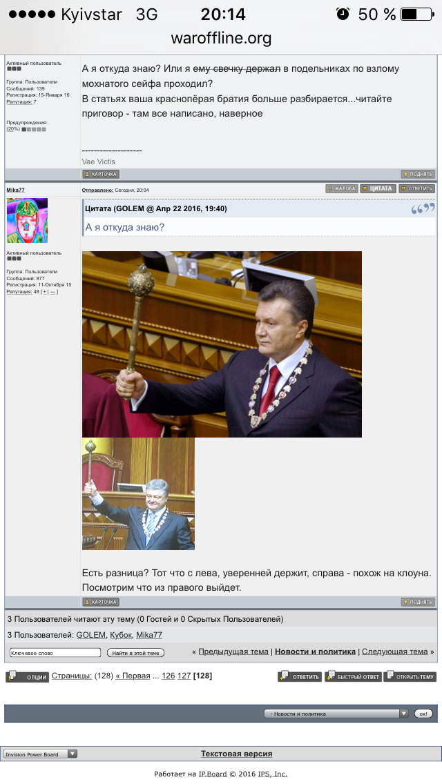 Цитата (ерш @ Апр 22 2016, 17:57) Та там така фигня приключилась.. если вкратце, то по расписанию должен быть очередной сходняк. "Самосоздался" алкогольный майдан. Думал даже поддержать хорошее дело. Позвали зеленых "человечков", говорят примета такая есть они к удаче. дальше было . http://censor.net.ua/v385582 потом митингувальников выкуривали и эвакуировали из занимаемых позицый черные человечки, видео выше. по не подтвержденным данным в промежутках между этими действами кто то облил депутата фекалиями, заботливо припасенными заранее... сюда такое не стал тащить.. Ничо не понял. Можете на пальцах пояснить-кто из них агенты ФСБ, а кто -агенты ГРУ? -------------------- Духовность, Смирение, Кефир!
