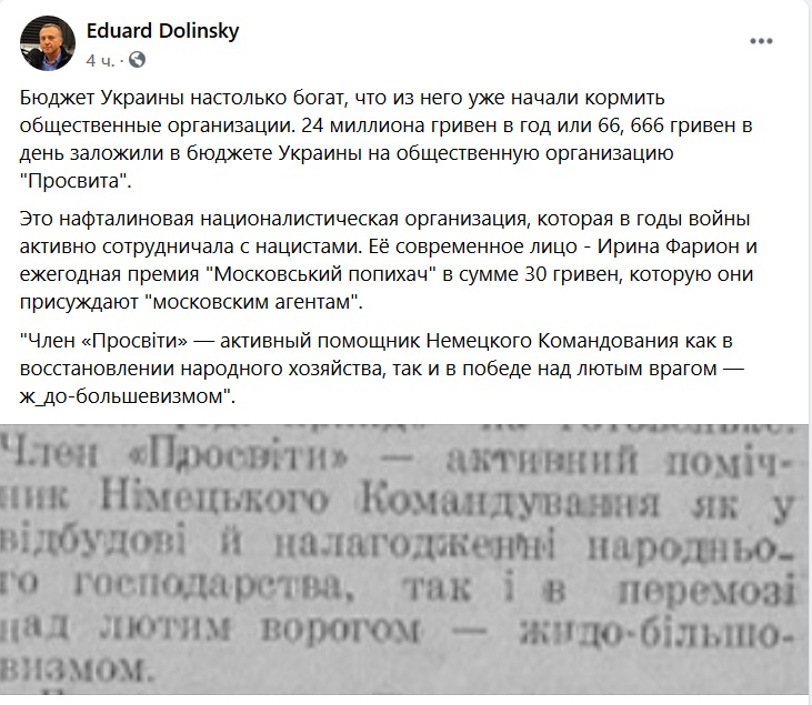 Цитата (Arqus @ Апр 12 2020, 19:38) Ты прикалываешься? "сообщение в «Мариюпольской газете» от 21 августа 1942 года о создании «Просвиты» в Волновахском районе Донецкой области: «Одержано з Волновахської міськкомендатури статут культурного об'єднання «Просвіта». Переведено з німецької мови на українську. Розіслано по всіх селах Волновахського району». Для целей этих «обществ» оккупанты выделяли лучшие здания занятых городов. Так, для «Просвиты» той же Волновахи оккупанты отремонтировали здание городского банка, под мариупольскую «Просвиту» выделили дом в центре города. Создавались кружки «по интересам»: драматический, хоровой, бандуры, танцев, истории Украины и… немецкого языка. Да-да, именно немецкого, а не украинского. То же самое значилось и в задачах других отделений «Просвит». Например, в Константиновке среди задач общества значилось: «вивчення німецької мови, як мови того народу, який приніс визволення українцям від жидо-більшовицького кріпацтва». https://varjag-2007.livejournal.com/164432.html Ты ж знаешь где это Волноваха да? Потому что это сейчас очень важный момент. Крайне важный. Возможно мы прямо здесь на пороге грандиозного исторического открытия бандеровского националистического движения на Донбассе. -------------------- Zа макееVский рОдничок