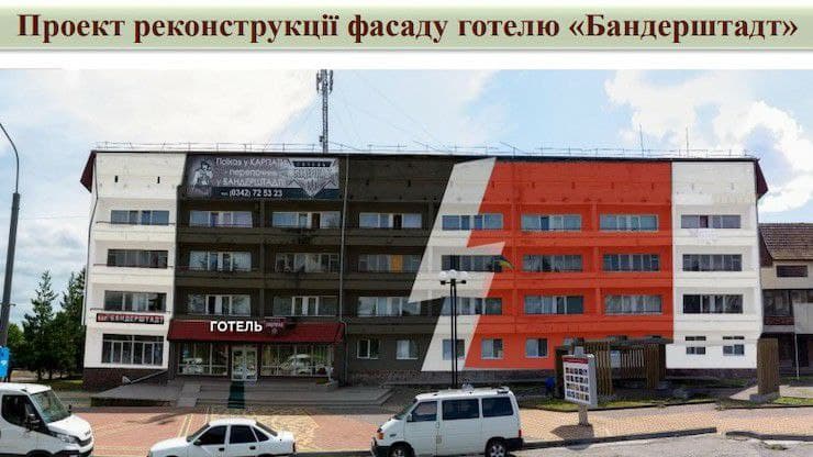 Марцинкив сообщил, что со времён СССР - это единственная коммунальная гостиница в городе. Она называлась "Прикарпатье" и была переименована в "Бандерштадт". Отель, построенный в 1960 году, расположен у аэропорта Ивано-Франковска. Когда-то он принимал экипажи самолётов и гостей, прибывающих авиатранспортом. Здесь размещены 34 номера: 17 одноместных, 16 двухместных и один полулюкс. Недавно в номерах установили бойлеры. Сейчас планируют провести полноценный ремонт с заменой окон и фасада. Отель находится на балансе КП "Комфортный дом". -------------------- Красный цвет - цвет администрации. © Pampa