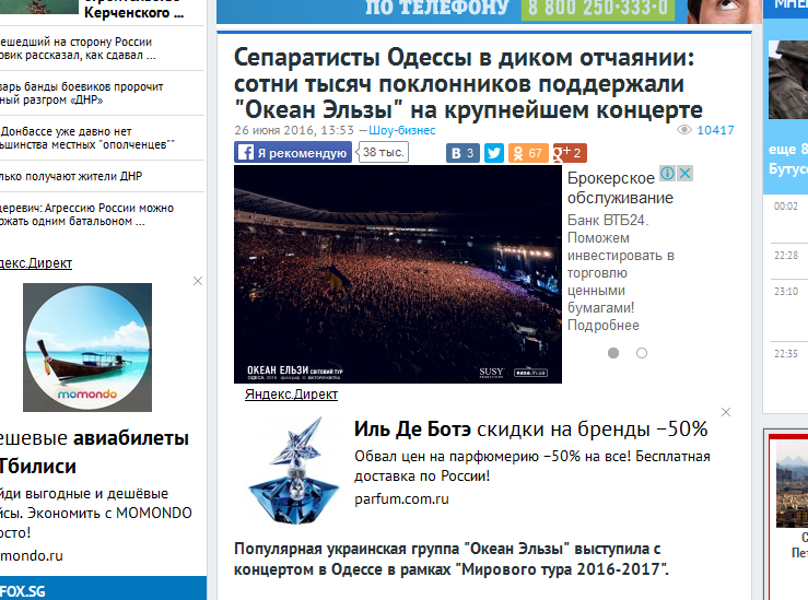 Цитата Сепаратисты Одессы в диком отчаянии: сотни тысяч поклонников поддержали "Океан Эльзы" на крупнейшем концерте И комент от равнодушного. Цитата Автор очень странный или так и не понял, о чем пишет. Одно с другим никак не связано (на счет сепаратистов). Нажмите для увеличения -------------------- |