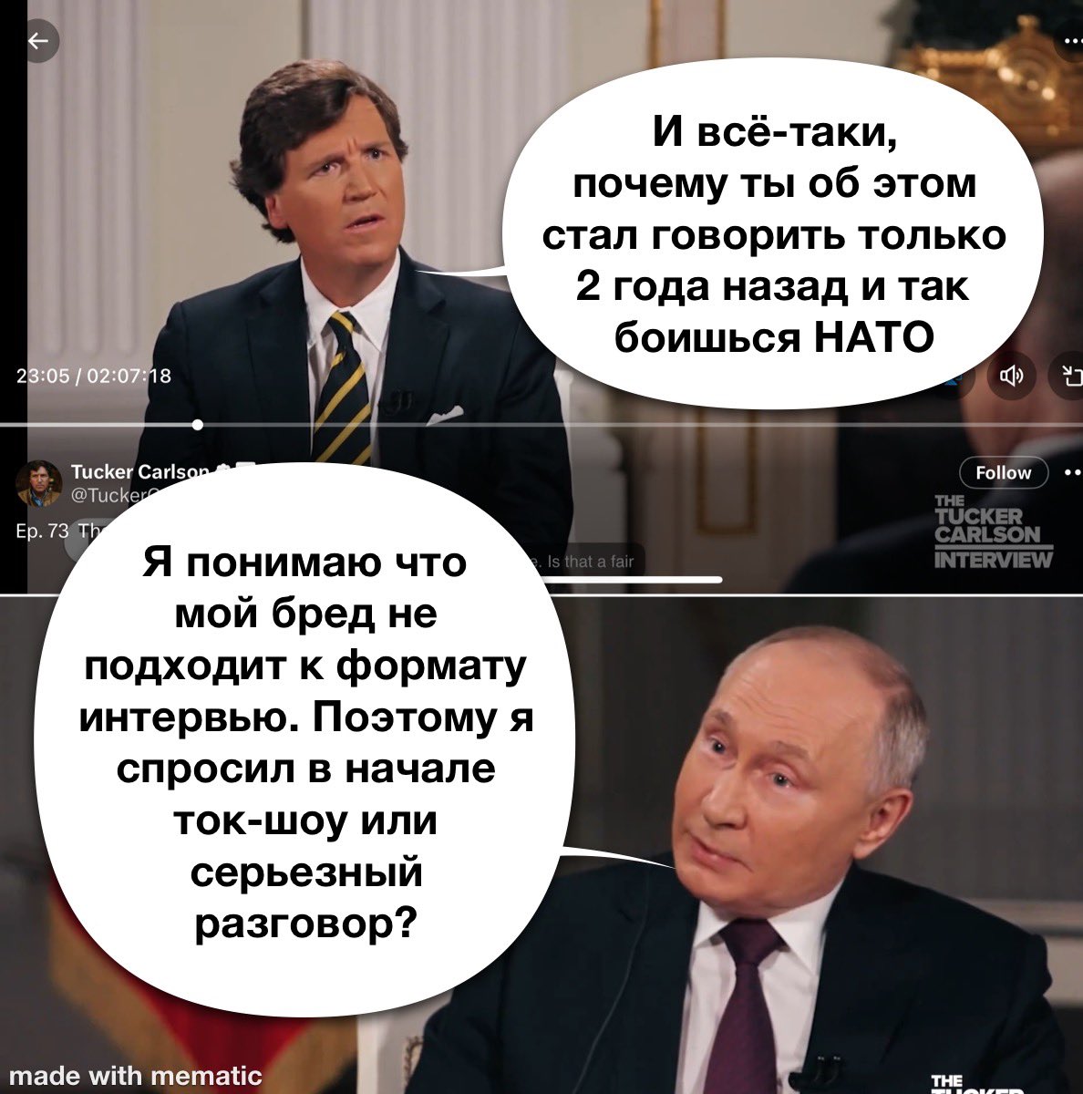 Он себя сегодня закопал с точки зрения пиара. Даже те на западе, реднёки и прочие ебанутые правые плосоземельщики, на которых питун мог делать ставку получать сочувствие и т.д. увидели что он даже по сравнению с ними просто дебил. Причём совершенно отбитый ссыкливый и неуверенный в себе маленький человечек. То что в рф слопают любое говно от него, это не вопрос. Но к тебе приезжает, хоть и пизданутый конспиролог которого фокс ньюз даже нахуй послала, но таки известный в нужных питуну кругах медийщик, через которого ты его аудитории можешь впарить нужные тебе наративы, в той упаковке, которую они съедят. Тут боброедка кстати права, нужно было про засилье лгбт, проклятых либерах, интересы стран говорить, а он начал лить им в уши внутреннее говно. Но то что хорошо русскому, немец или американец этого просто не поймут, какой нахуй новгород, какая переяславская рада, что за блеянье обоссавшегося от страха чушкана, про нас вынудили. Он просто на весь мир, выставил себя мелким, жалким, обосравшемся от страха тупым маразматиком. -------------------- афган + 2 чеченское 28209 убитых и более 88000 раненых, итого общие потери более 116000. «Бывают времена, когда люди принимают коллективную вонь за единство духа.» |