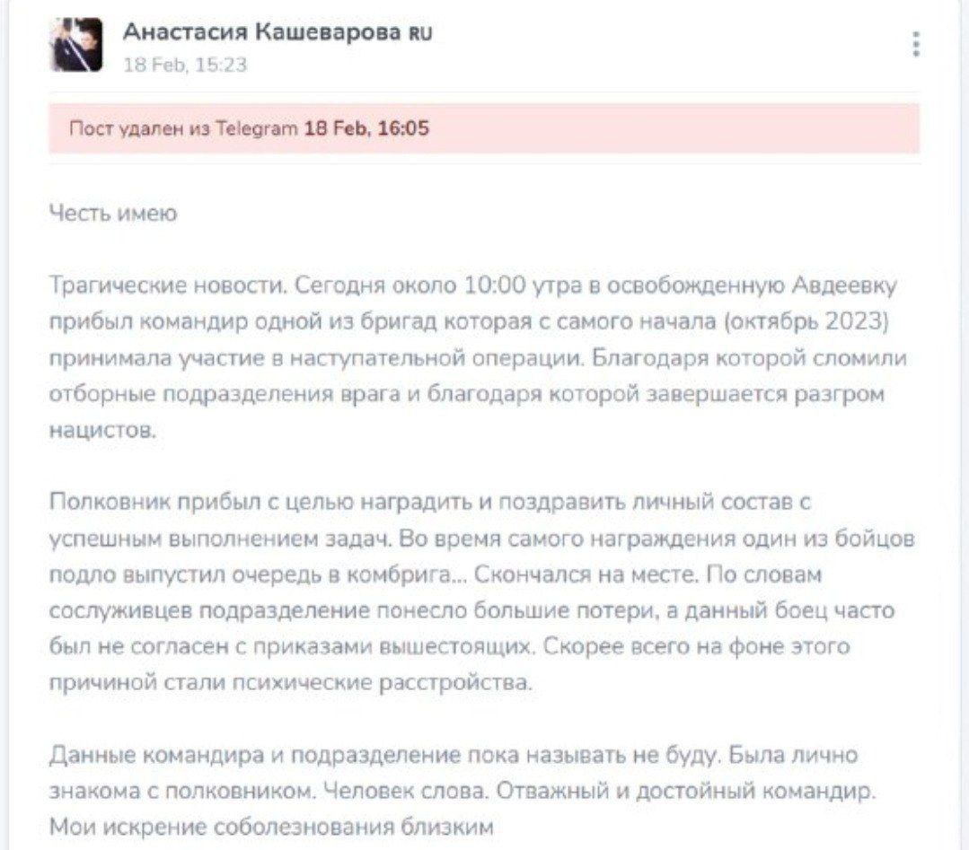 Цитата (Наблюдатель @ Фев 18 2024, 20:42) На зет-каналах показали с десяток пленных из Авдеевки. На укро-каналах показали с десяток пленных из Авдеевки. В целов украинская полуокруженная группировка обделалась легким испугом. Мост был не слишком далеко. Коксохим из-за хаоса-неразберихи таки потеряли. А мог бьіть шверпункт еще на месяц-два боев. -------------------- Хотите найти хороших русских, ищите в посадках.