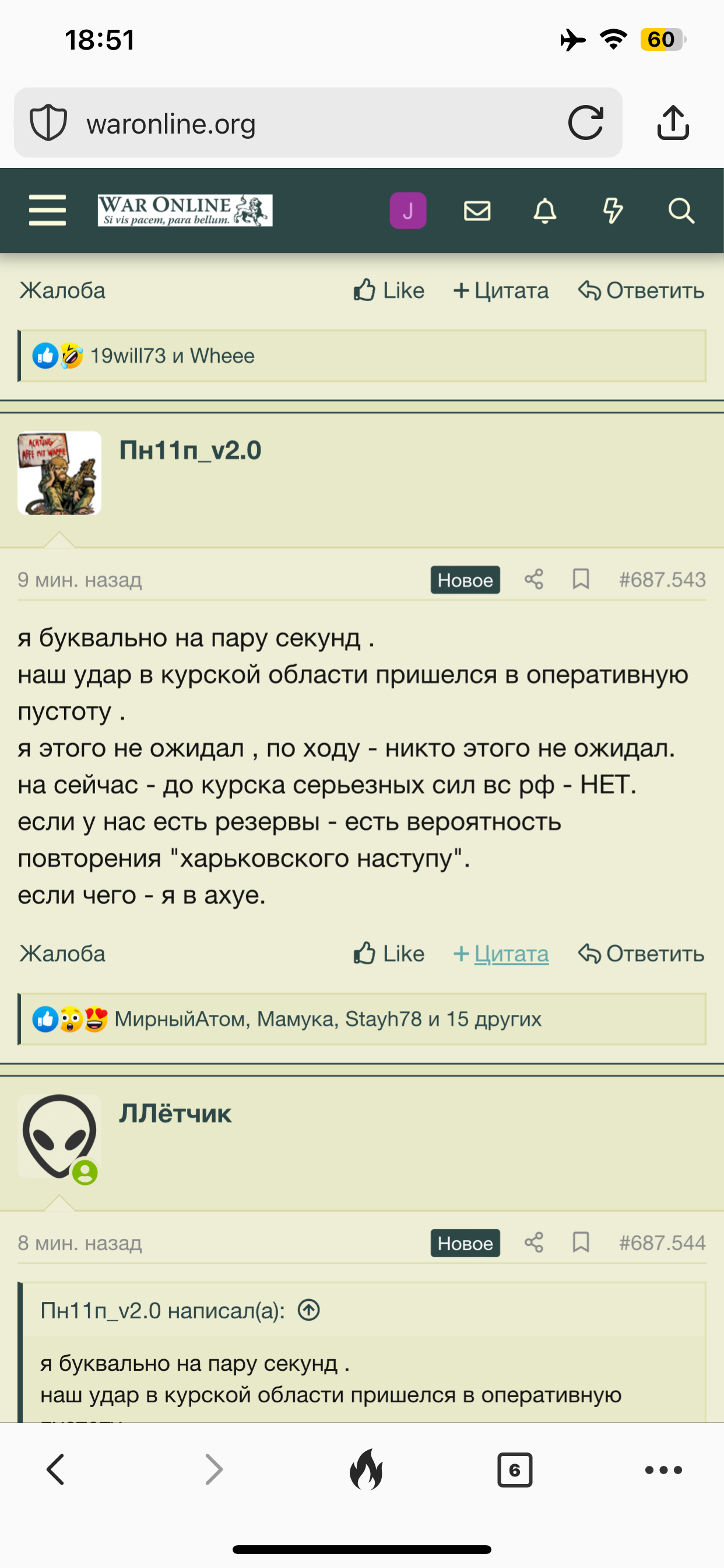 Цитата Противник действует мотопехотными подразделениями в стиле манёвренной войны и не вступает в бои за наши опорные пункты. По-сути это то, что немцы исполняли в 41. Или хохлы исполняли осенью 2022 в Харьковской области. Это не штурмы опорников и посадок и не бои за каждый дом. -------------------- Хотите найти хороших русских, ищите в посадках.