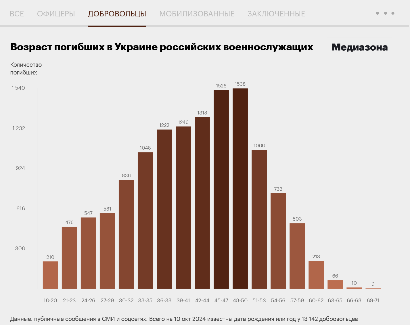 Цитата (Nechriste @ Окт 11 2024, 19:51) "Нежели пенсам" - безусловно. Но в данном случае под "дедами" понимается скорее категория 45-55 лет - это вполне работоспособный возраст, для многих пик карьеры и/или заработков. Прям настоящих пенсов старше 65 - в некроложных сводках почти нет (а которые есть - думаю воевали не под морф, а в чвк или полулегальных добровольческих отрядах), да и старше 60 не много. Пик - 45-50 лет, потом резкое снижение. Ну и уж во всяком случае в возрасте 30-40 подавляющее большинство зарабатывает больше, чем в возрасте 20-30. ![]() З.Ы. 45-55 - это как раз люди, успевшие достаточно долго пожить при союзе, но еще не настолько немощные, чтобы быть совсем непригодными к войне... в этом возрасте у каждого уже по 3-4 хронических болячки, не считая убитой печени. Плюс всё больше нужны знания высоких технологий, а с мозгами в этом возрасте уже не очень. Так что этот возраст уже не особо конкурентоспособен. -------------------- афган + 2 чеченское 28209 убитых и более 88000 раненых, итого общие потери более 116000. «Бывают времена, когда люди принимают коллективную вонь за единство духа.» |