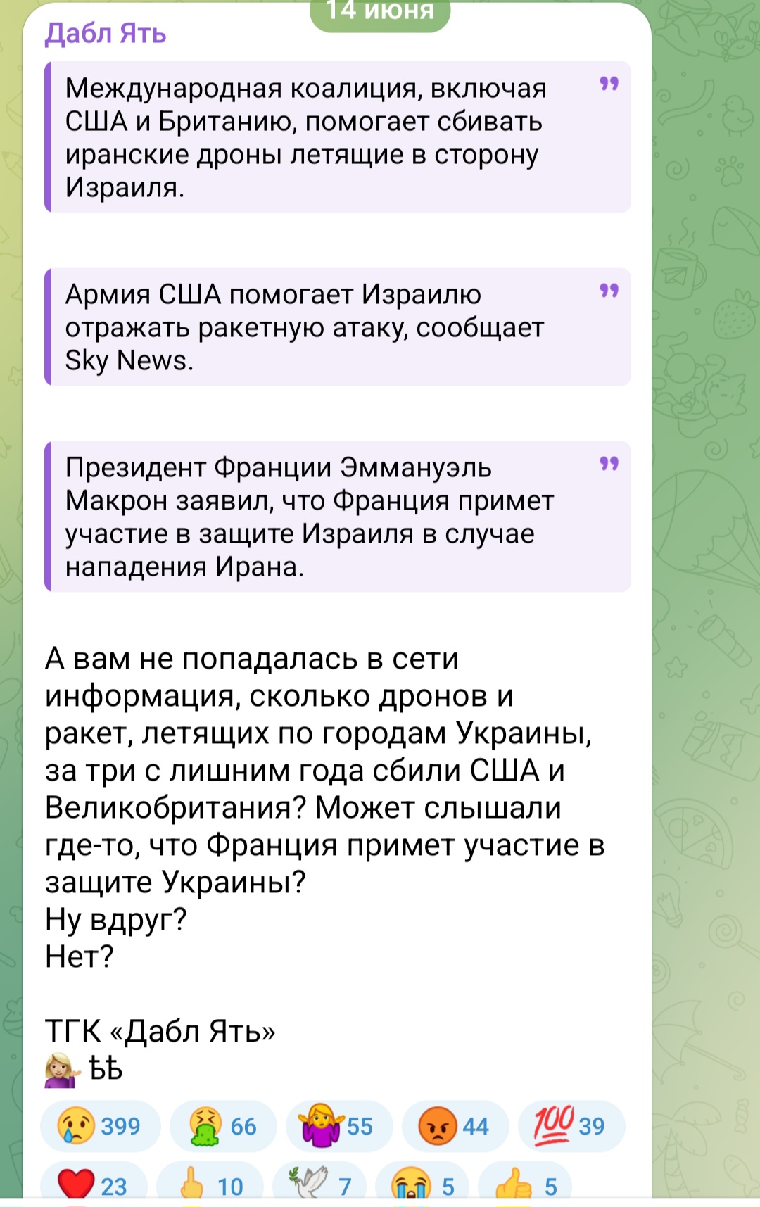Цитата (Аарон @ Июн 14 2025, 07:02) В Ришоне 2 погибших. Попадание в частный дом. "Потерь нет!" Вот это надо писать! Извини за высокомерие ,но у нас тут больший опыт. Падать могут разве что обломки ракет..... А "Купол" ....он просто великолепен. -------------------- больше всех в колхозе работала лошадь